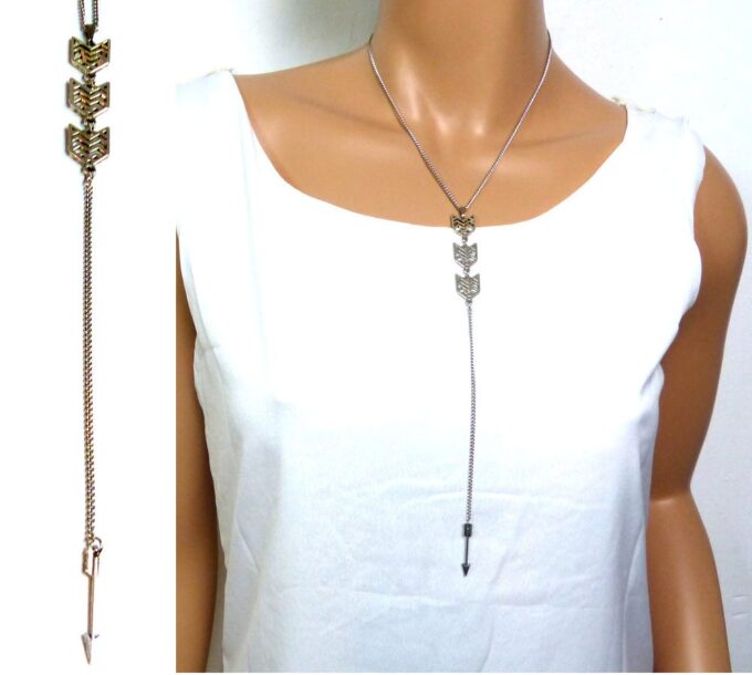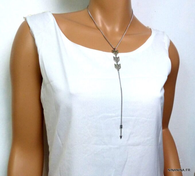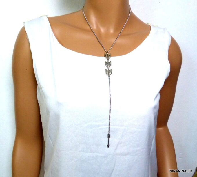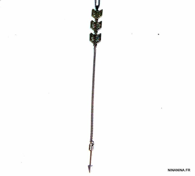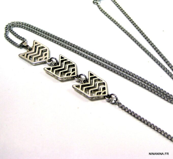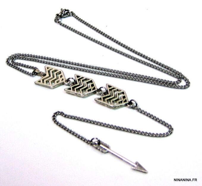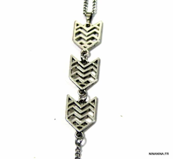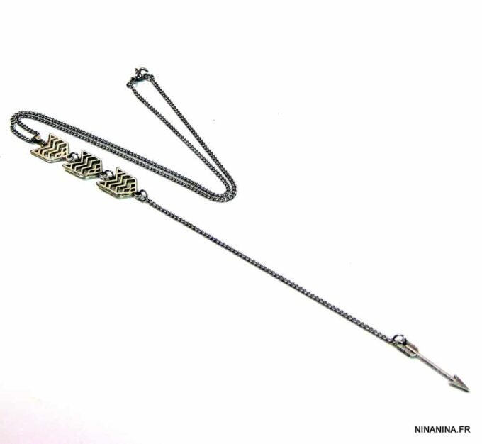 Collier acier inoxydable composée de pendentifs triangulaires et d’une flèche en métal argenté montés sur une chainette en acier inoxydable. Fermoir mousqueton. Longueur du collier : 45 cm. Longueur du pendant : 20 cm env. Taille unique. Livré dans sa pochette d’organza. Bijou 100% fait-main.