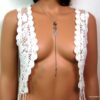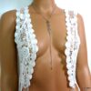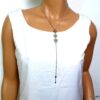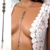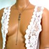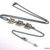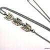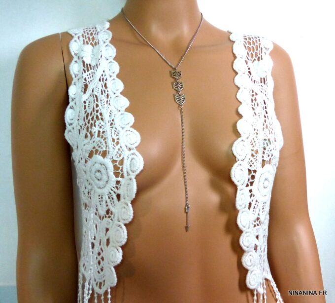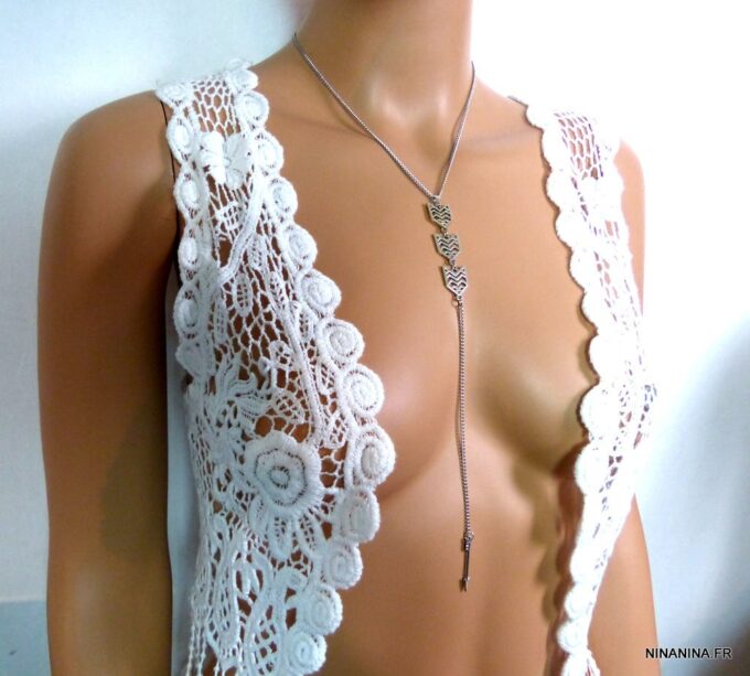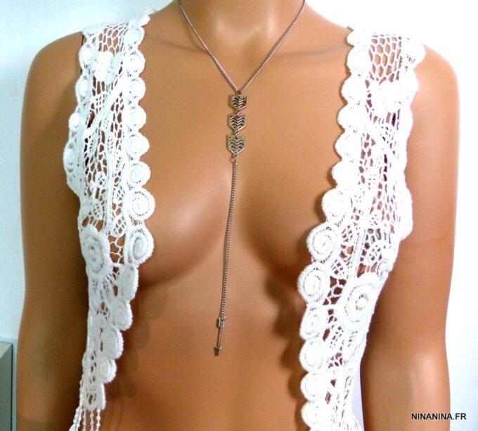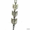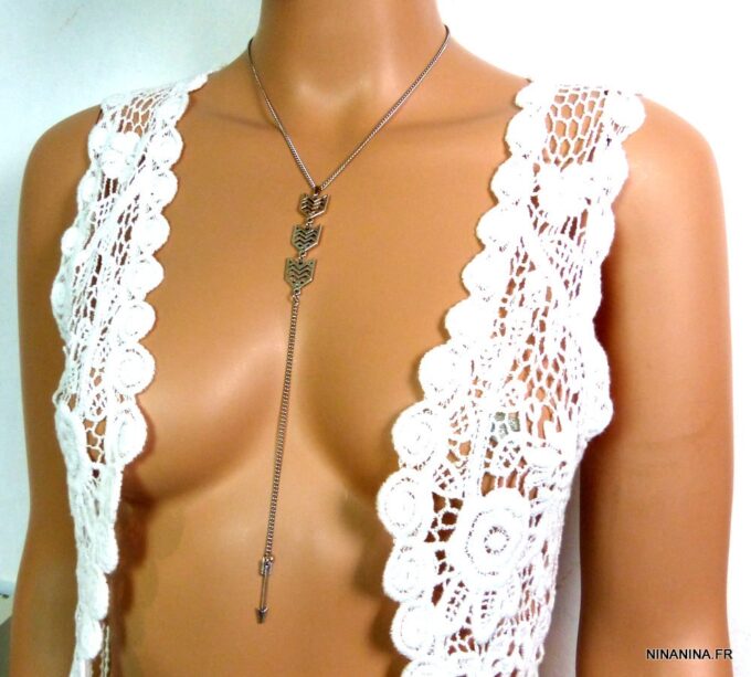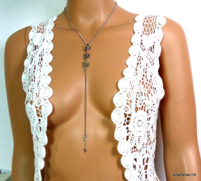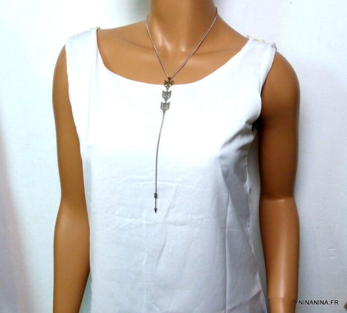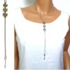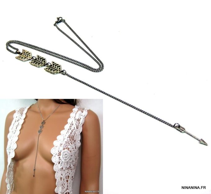Collier acier inoxydable composée de pendentifs triangulaires et d’une flèche en métal argenté montés sur une chainette en acier inoxydable. Fermoir mousqueton. Longueur du collier : 45 cm. Longueur du pendant : 20 cm env. Taille unique. Livré dans sa pochette d’organza. Bijou 100% fait-main.