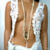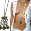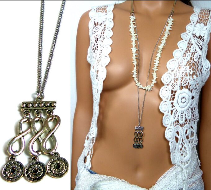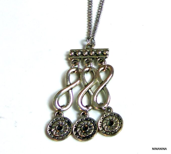 Collier long infini acier inoxydable composée d’un pendentif rectangulaire en métal argenté monté sur une chainette en acier inoxydable. Dim du pendentif : 5,5 X 3 cm.