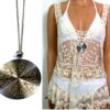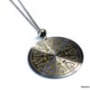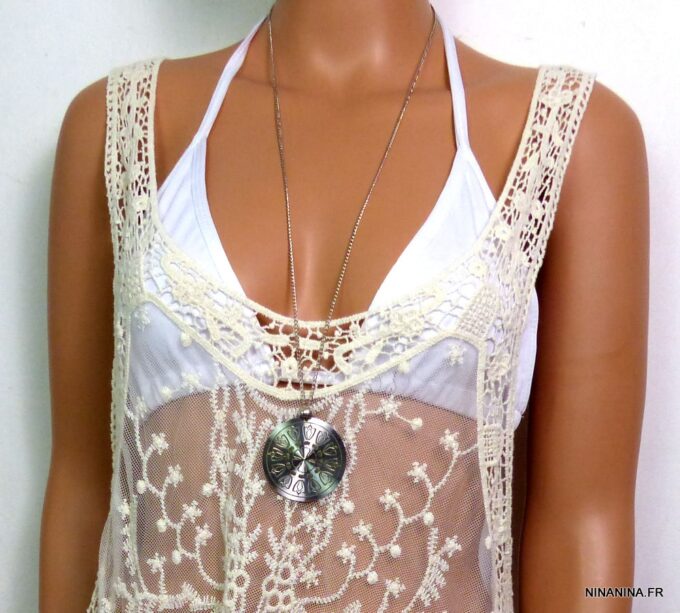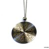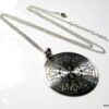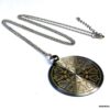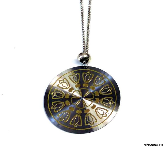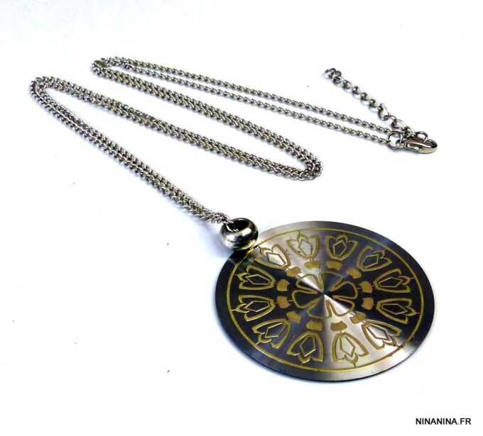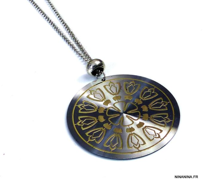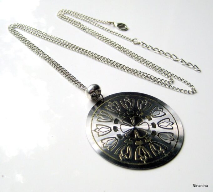 Collier long acier inoxydable composé d’un pendentif rond en métal argenté monté sur chaine en acier inoxydable. Diamètre du pendentif : 5 cm env. Longueur : 80 cm environ. Fermoir mousqueton. Livré dans sa pochette d’organza. Bijou 100% fait-main.