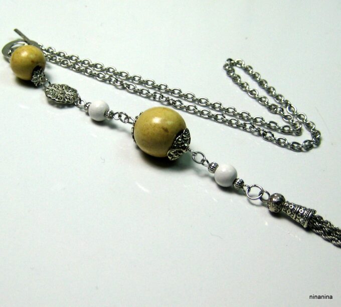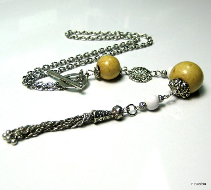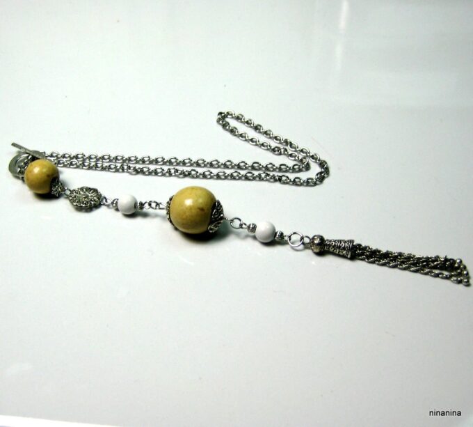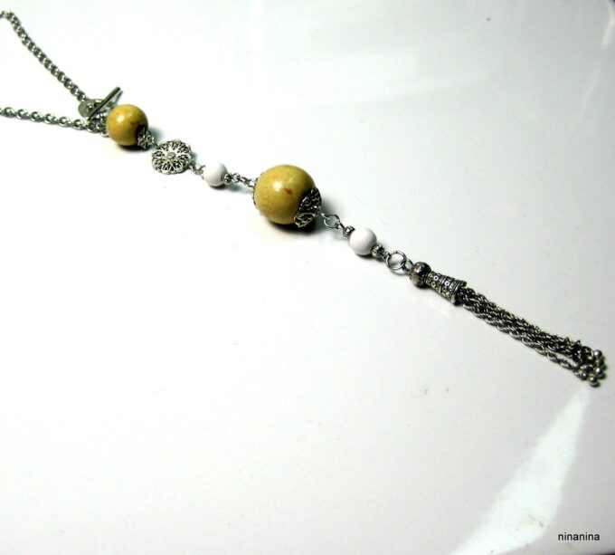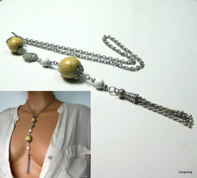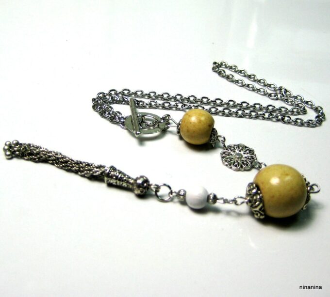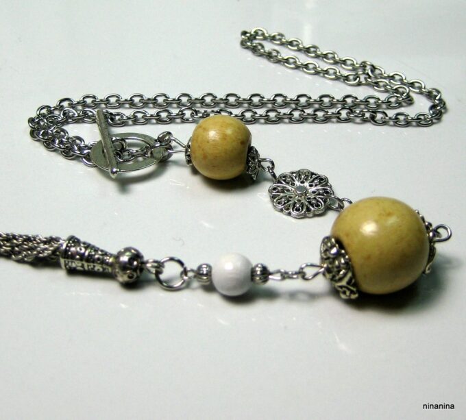 Ce Collier perles bois et pompon métal argenté original, raffiné et élégant enlace le cou de sa chaine en acier inoxydable argenté. Il est composé de perles en bois blanches et blanc cassé et métal argenté et d’un pompon montés sur chaine en acier inoxydable et se termine par un fermoir cheville sûr et facile d’utilisation. Il fera un Cadeau parfait pour la St Valentin ou les Noces de bois qui célèbrent le 5ème anniversaire de mariage!