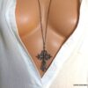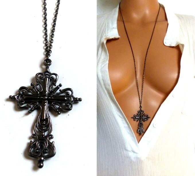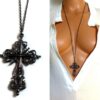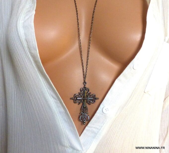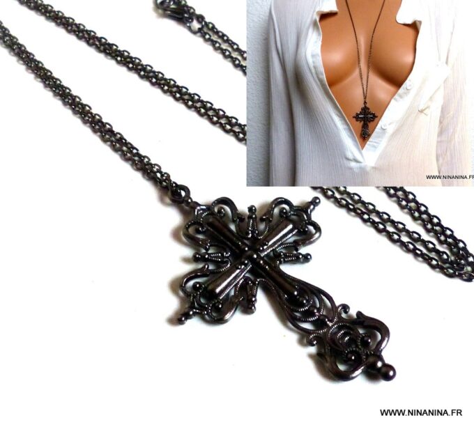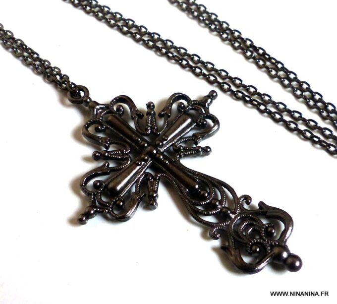 Longue chaine noire pendentif croix gothique – collier femme composé d’un pendentif croix filigrané en métal noir monté sur chaine en métal noir.