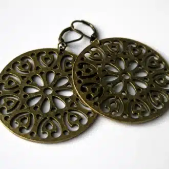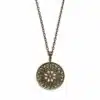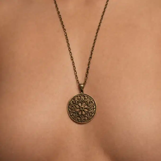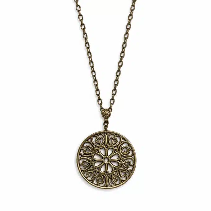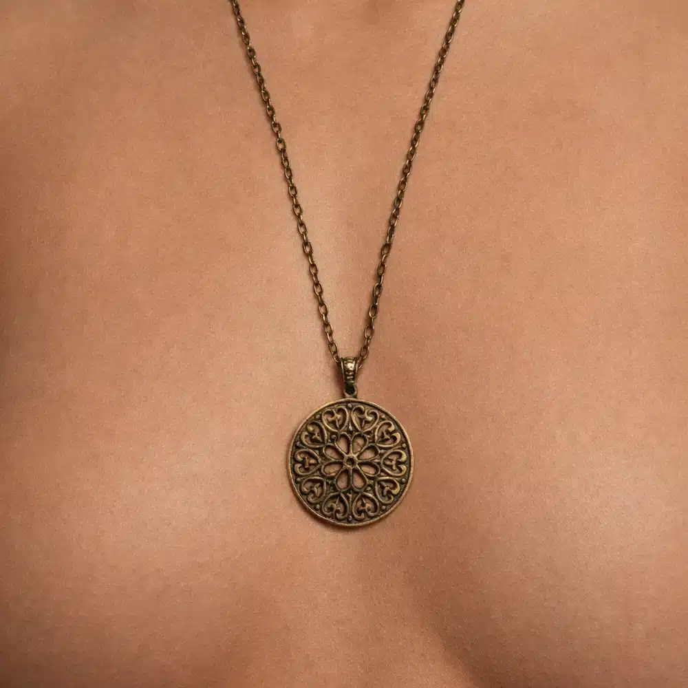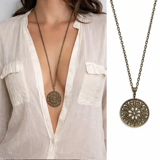 Ce collier fantaisie pour femme en métal bronze se distingue par son élégant pendentif rond ajouré aux motifs délicatement travaillés. Inspiré des bijoux vintage, il apporte une touche bohème chic et authentique à votre tenue.