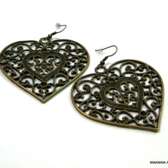 Collier long métal bronze constitué d’un pendentif et une breloque coeur en métal bronze montés sur fine chainette en métal bronze. Dim du pendentif : 5,5 X 5,5 cm. Longueur : 80 cm enianv. Fermoir mousqueton. Livré dans sa pochette d’organza. Bijou 100% fait-main