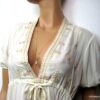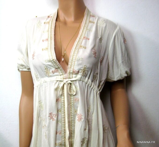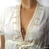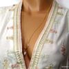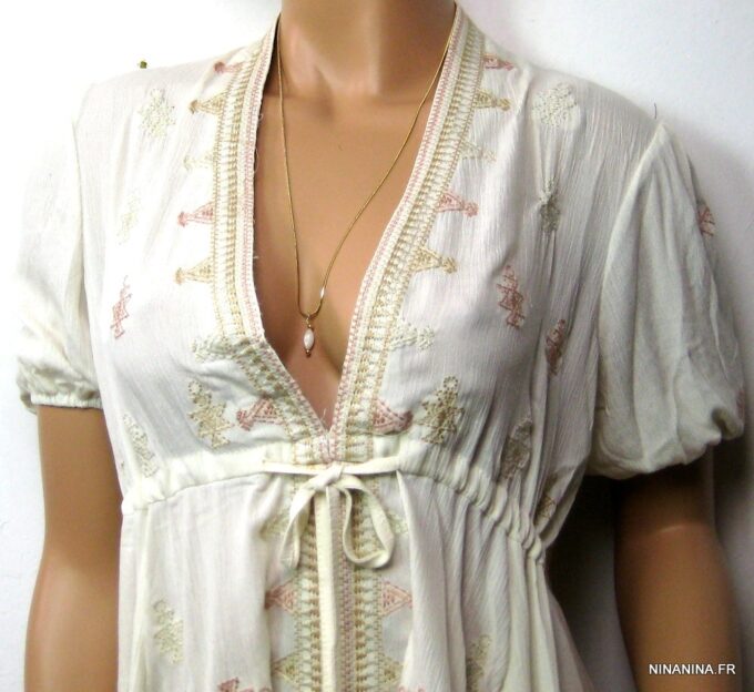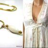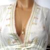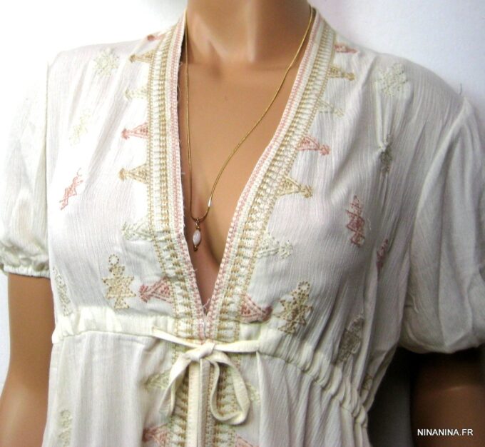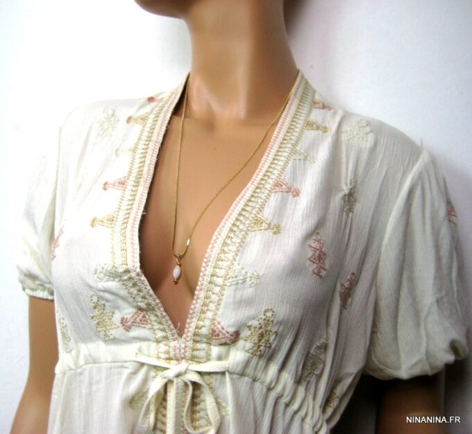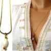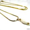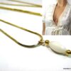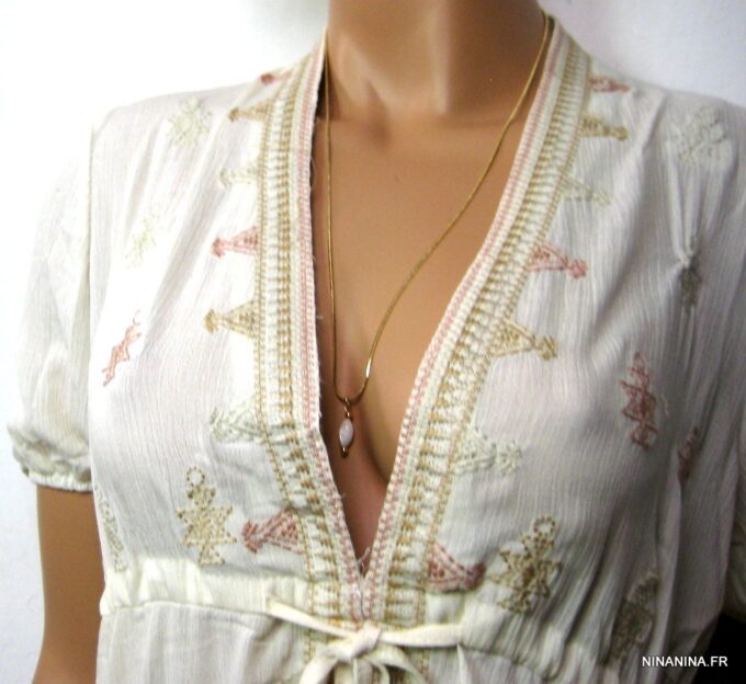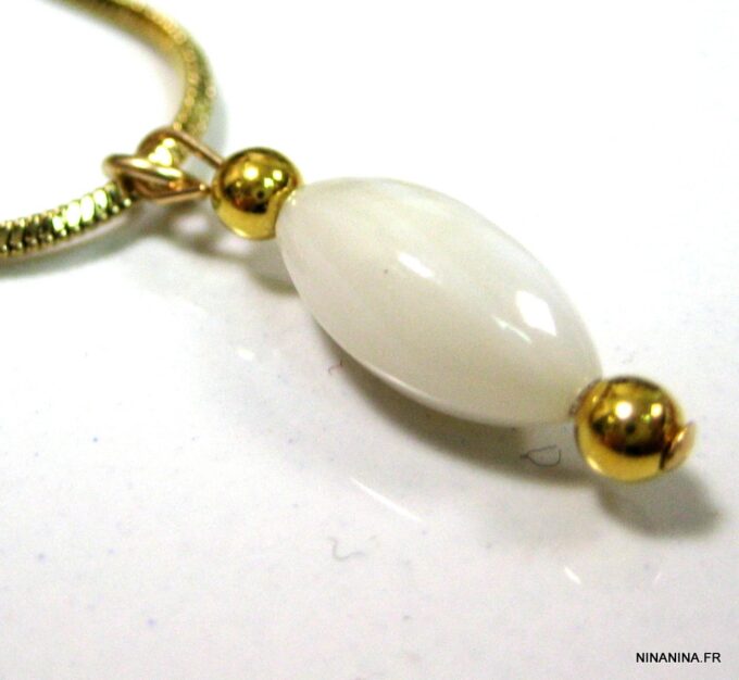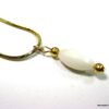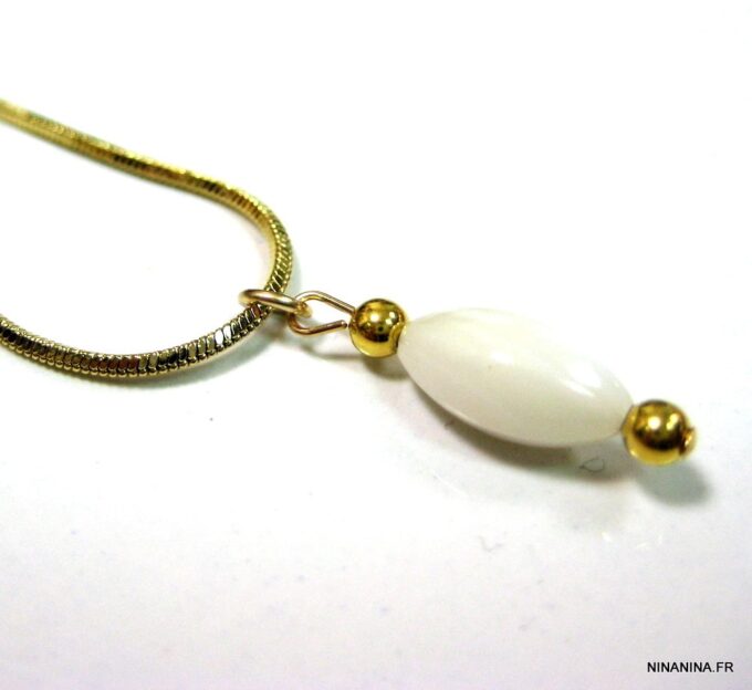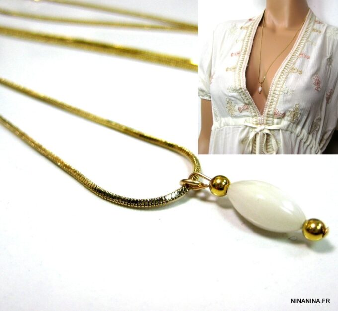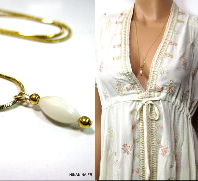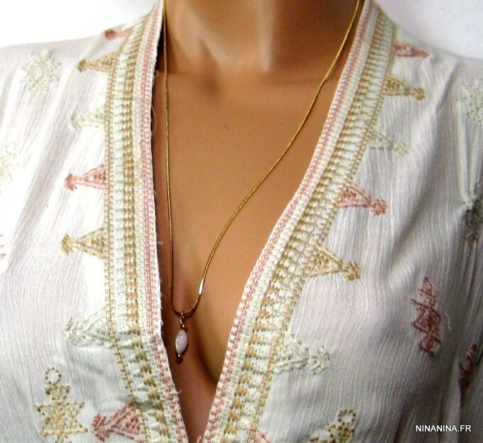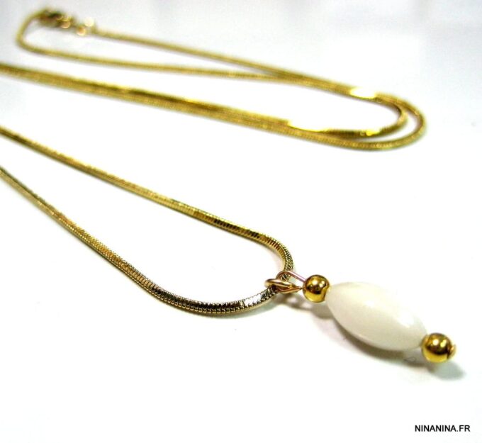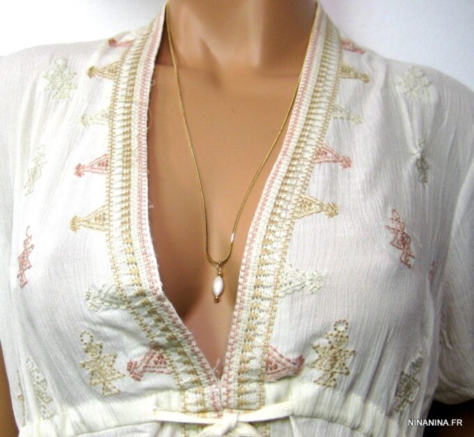 Collier long sautoir plaqué or et nacre composé d’une goutte en nacre blanche montée sur chainette serpent en plaqué or 14 carats. Fermoir mousqueton. Longueur : 76 cm. Livré dans sa pochette d’organza. Bijou 100% fait-main. Poids : 1,8 g