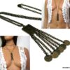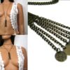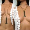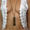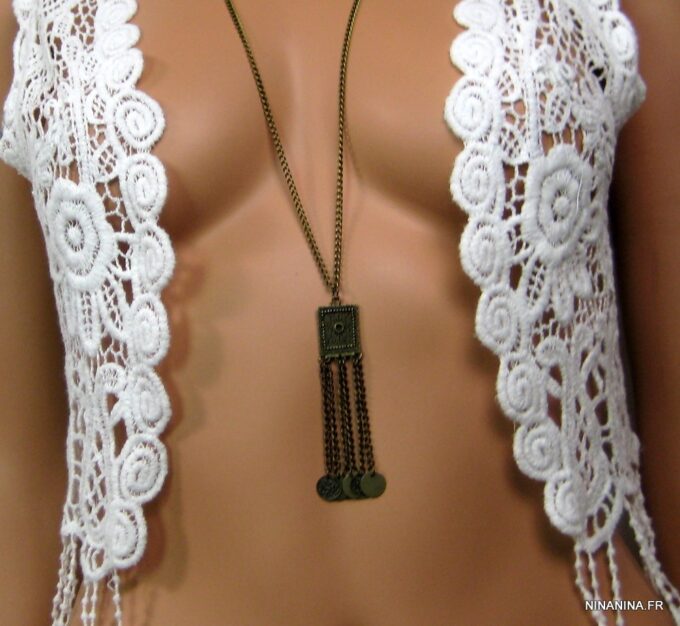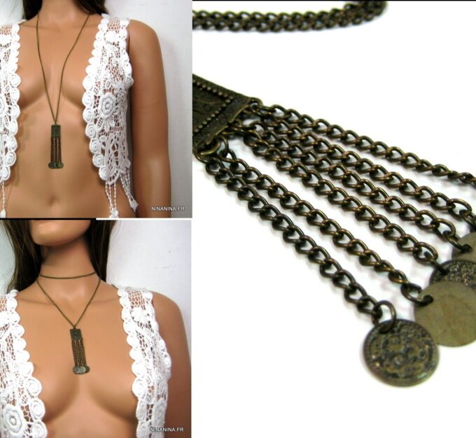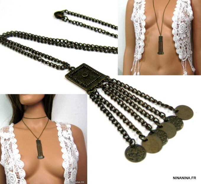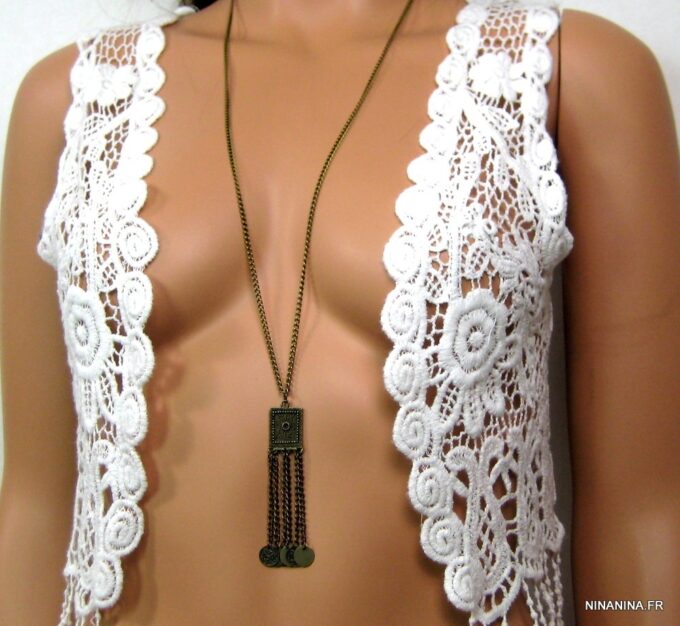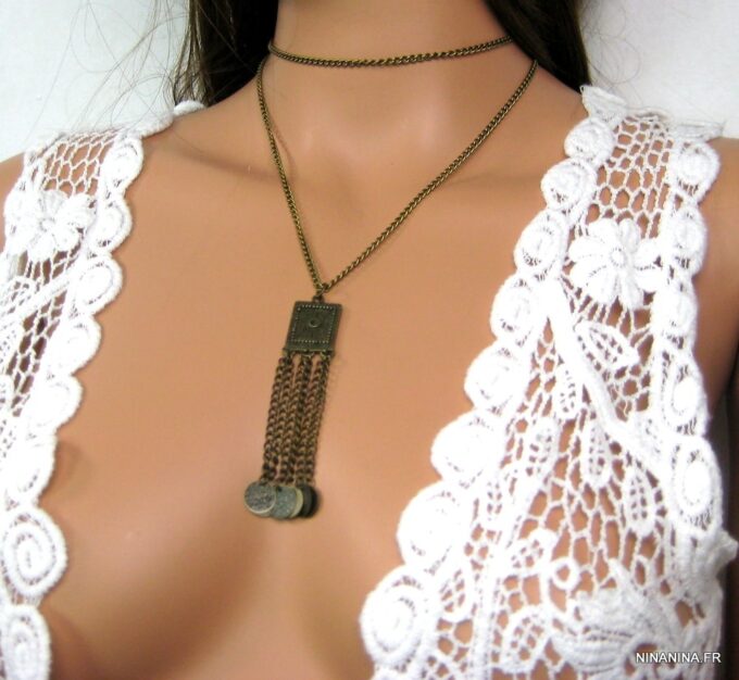 Collier long pompon métal bronze composé d’un pendentif rectangulaire et de sequins ronds en métal bronze montés sur une chainette en métal bronze. Dim du pendentif : 2,5 X 1,6 cm. Longueur totale du pendentif : 7,5 cm environ. Fermoir mousqueton. Longueur totale (fermoir compris) : 80 cm env. Peut se porter long ou court (2 tours). Livré dans sa pochette d’organza
