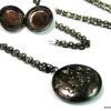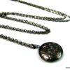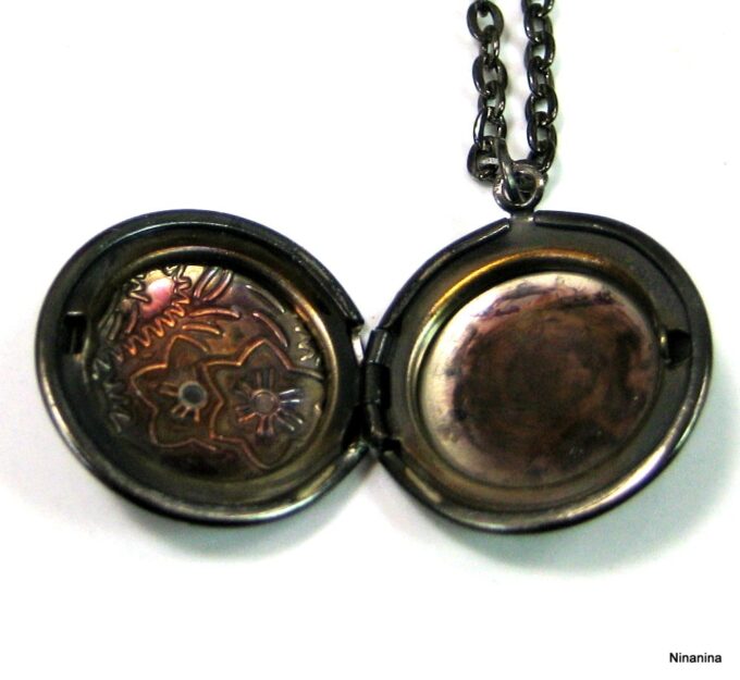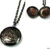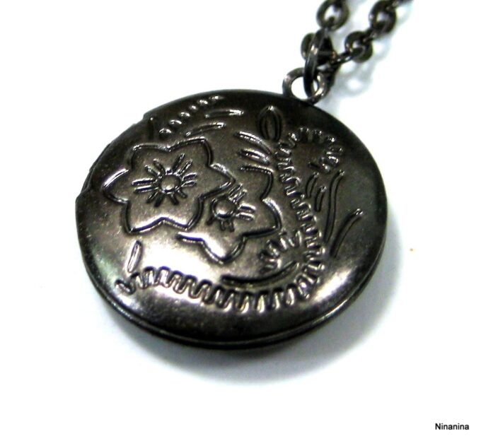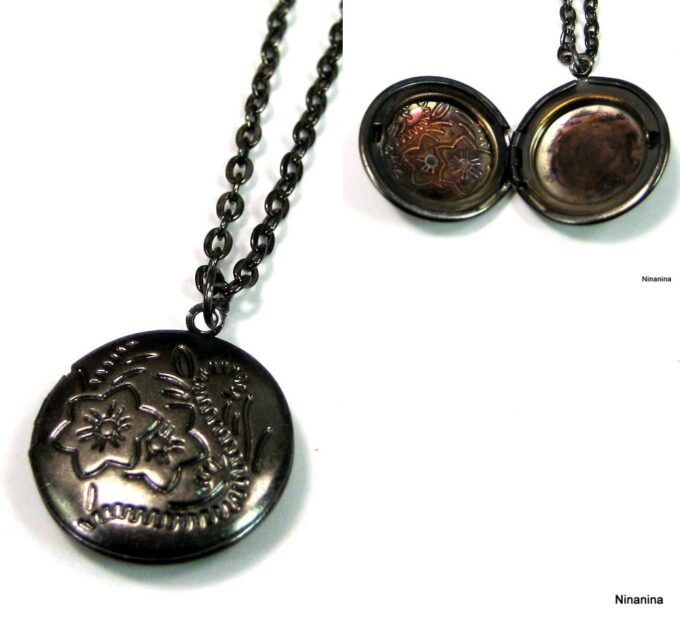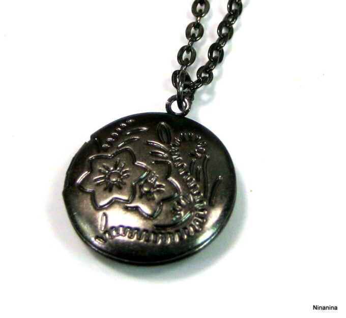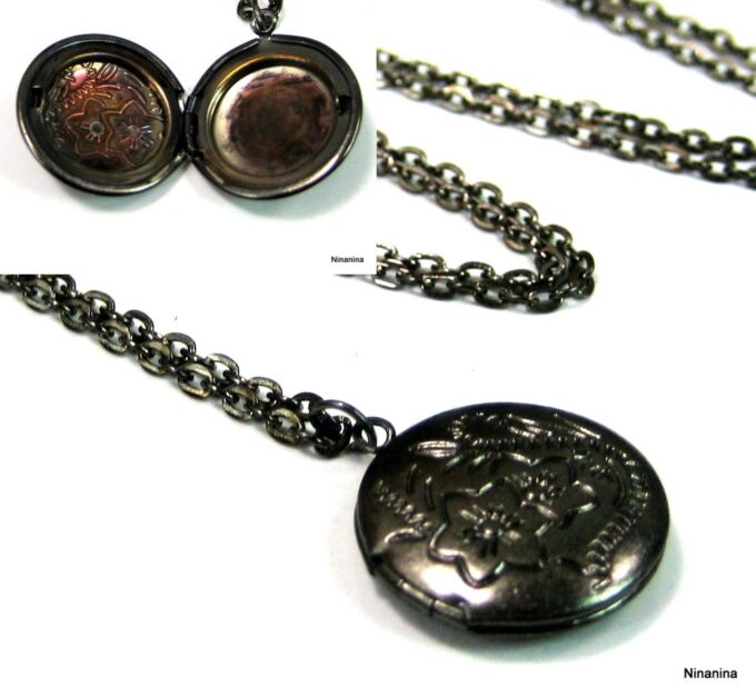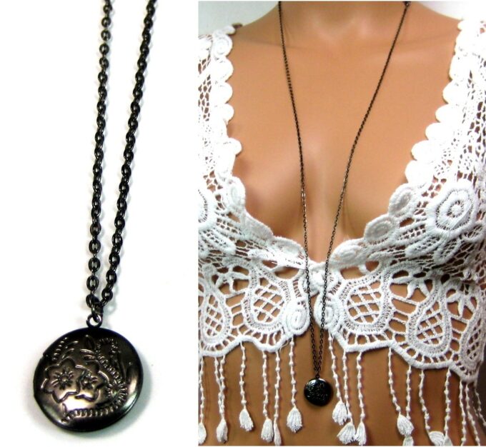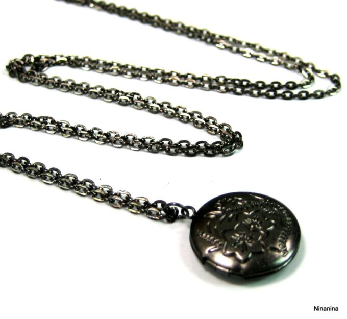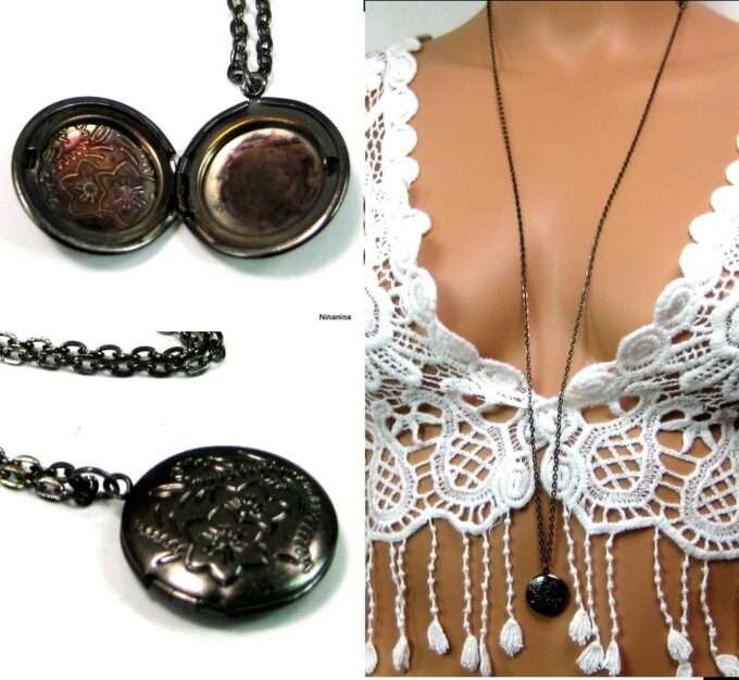 Collier medaillon photo long – Sautoir porte photo noir composé d’un pendentif rond porte-photo en métal noir monté sur fine chainette. Dim du pendentif : 2 X 2 cm env. Longueur : 90 cm environ. Fermoir mousqueton. Livré dans sa pochette d’organza. Bijou 100% fait-main.