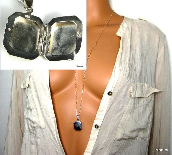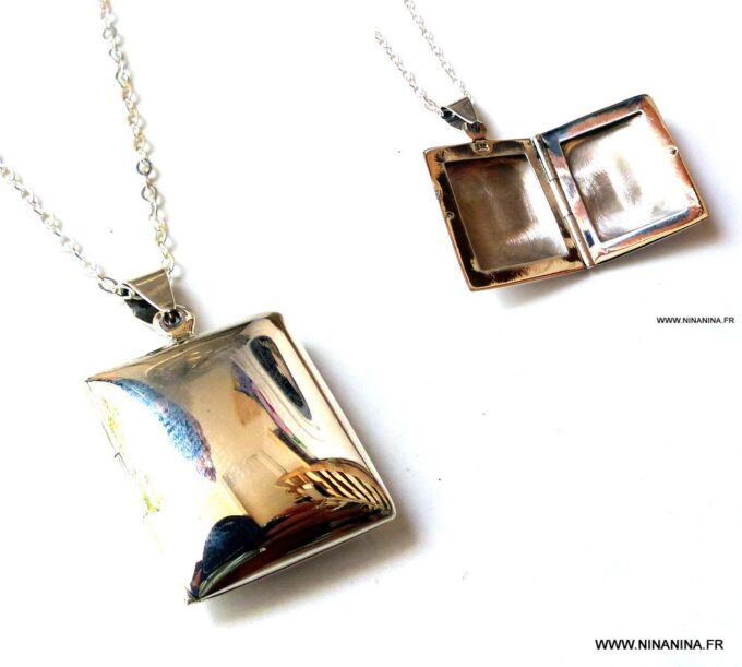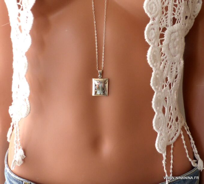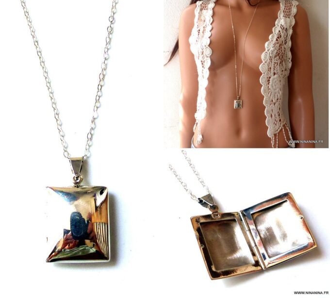 Sautoir porte photo pendentif carré Argent – Collier long en argent massif composé d’un pendentif rectangulaire porte-photo en argent 925 monté sur une chaînette (1mm de diamètre) en argent 925.