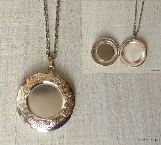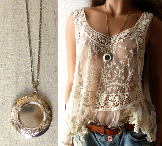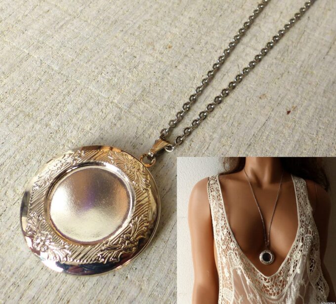 Collier long – Sautoir Acier inoxydable porte photo composé d’un pendentif boite rond porte-photo en métal argenté monté sur une fine chainette en Acier inoxydable.