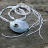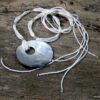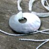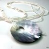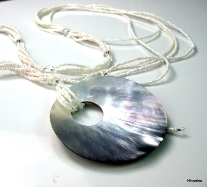 Collier long – sautoir nacre et rocailles composé d’un pendentif rond en nacre et de perles facettées en résine transparente montés sur 5 rangs de rocailles blanches. Diamètre du pendentif : 6,5 cm env. Longueur totale : 90 cm env. Livré dans sa pochette d’organza.