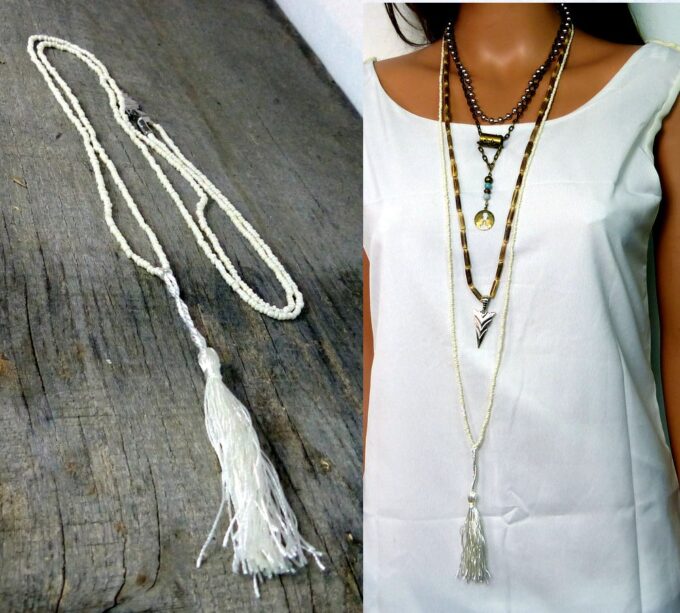 Portez ce joli Collier perles de rocaille blanches et pompon blanc sur votre maillot de bain à la plage ou avec sur une robe le soir, seul pour un look bohème ou en superposition avec d’autres colliers Ninanina; Un bijou ethnique chic qui affinera votre silhouette. seul pour un look minimaliste ou en superposition avec d’autres colliers Ninanina; Astuce Ninanina : Vous pouvez également l’enrouler autour de votre poignet et le transformer ainsi en bracelet wrap ultra tendance ou le poser sur vos hanches pour en faire une magnifique chaine de taille ! Un bijou multifonctions dont vous ne pourrez plus vous passer !
