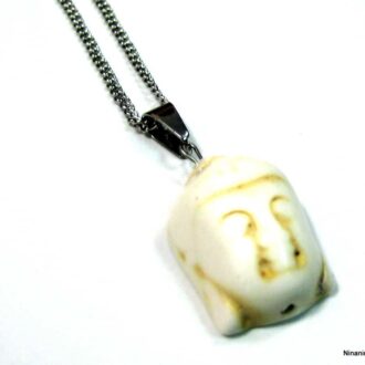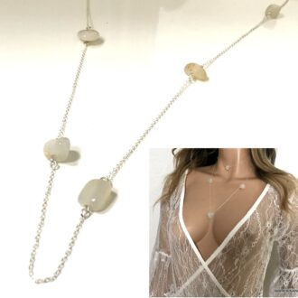 Collier femme long – sautoir acier inoxydable et nacre composé de palets de nacre blanche montés sur une chainette mailles ovales en acier inoxydable.