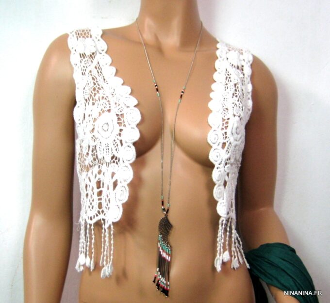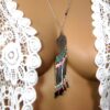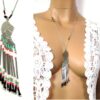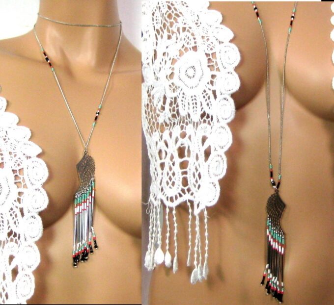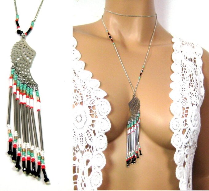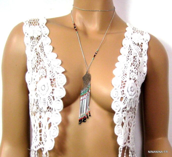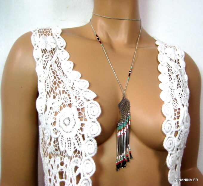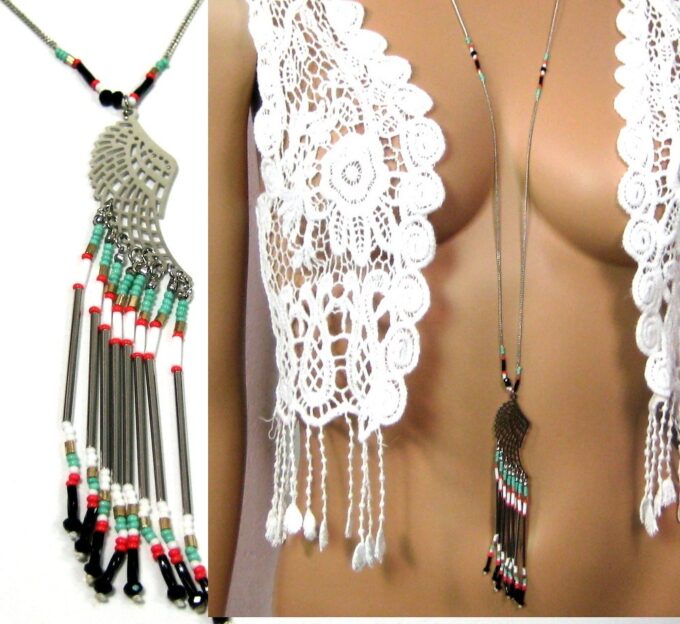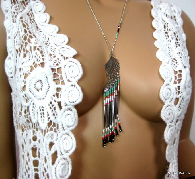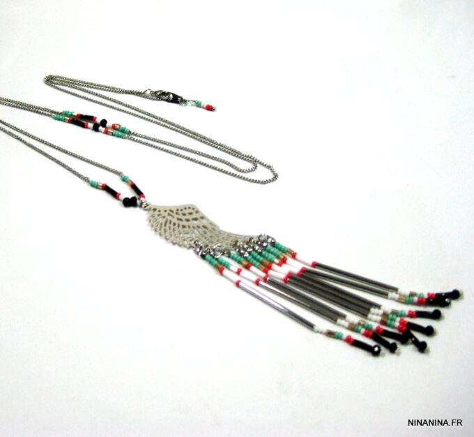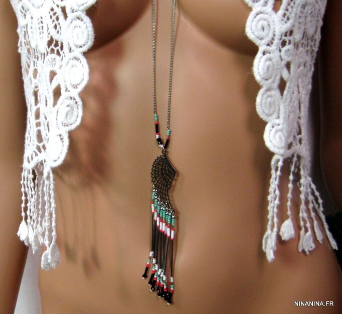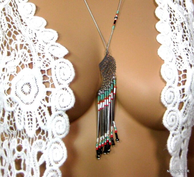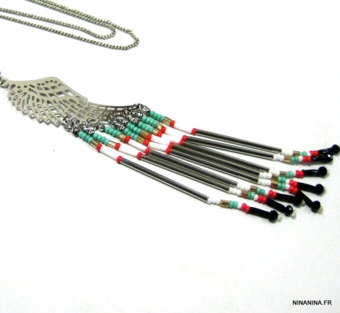 Collier long – sautoir aile d’ange rocailles multicolores composé d’un pendentif aile d’ange en acier inoxydable et perles de rocailles multicolores monté sur une chainette en acier inoxydable. Dim du pendentif : 12 X 2 cm. Longueur (fermoir compris) : 90 cm. Peut se porter long ou court (2 tours). Fermoir mousqueton. Livré dans sa pochette d’organza. Bijou 100% fait-main.