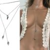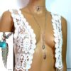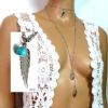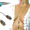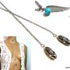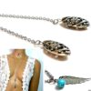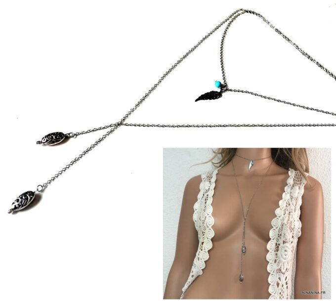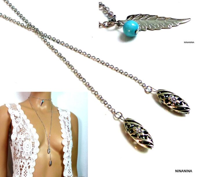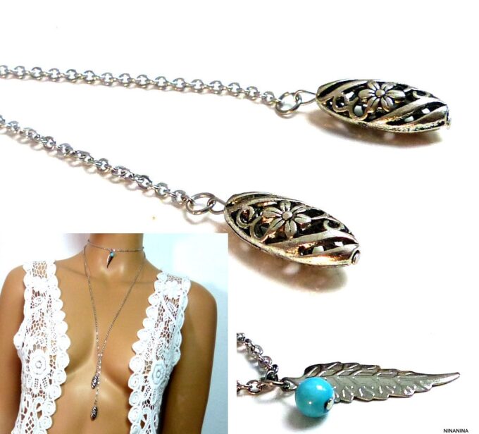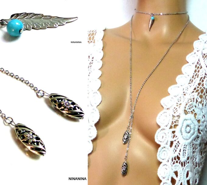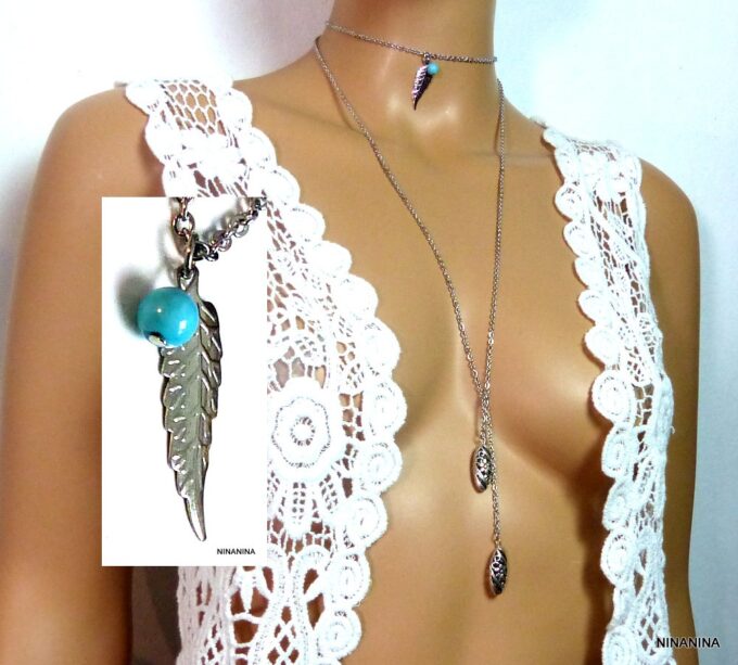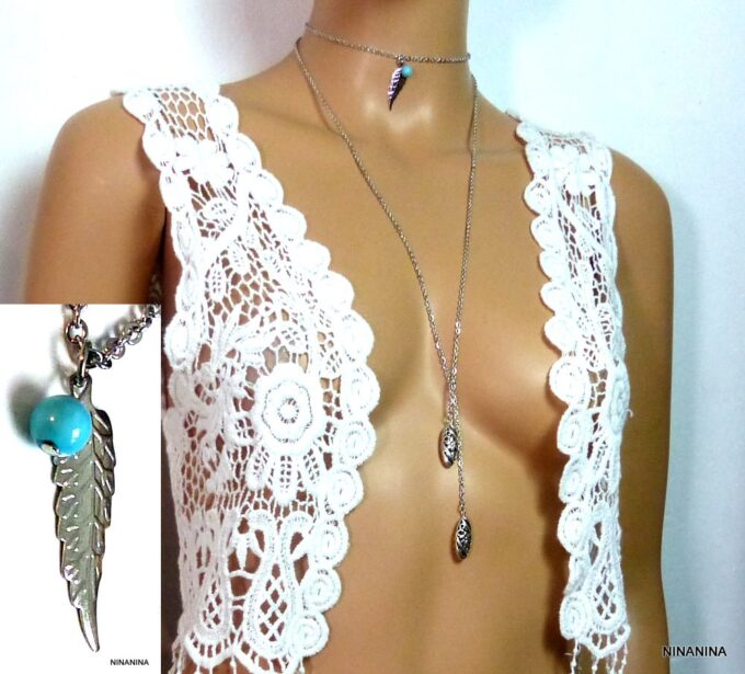 Sautoir Acier inoxydable plume argentée turquoise bleue composé de pendentifs ovales en métal argenté, d’une petite plume en acier inoxydable et d’une petite turquoise ronde montées sur une chaînette (1mm de diamètre) en acier inoxydable à enrouler autour du cou.