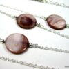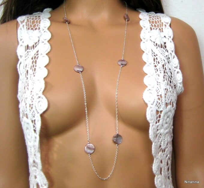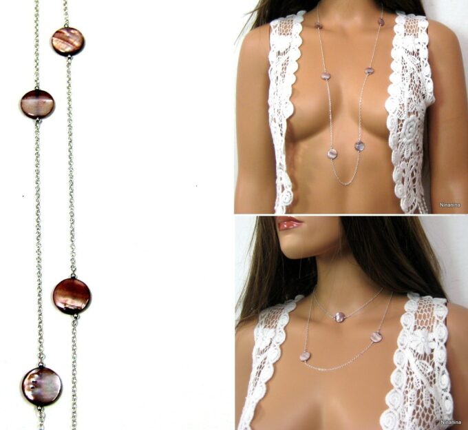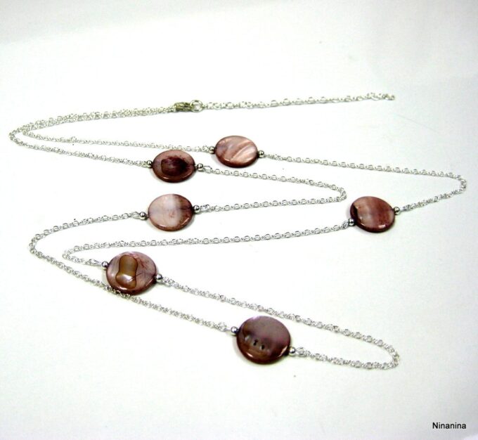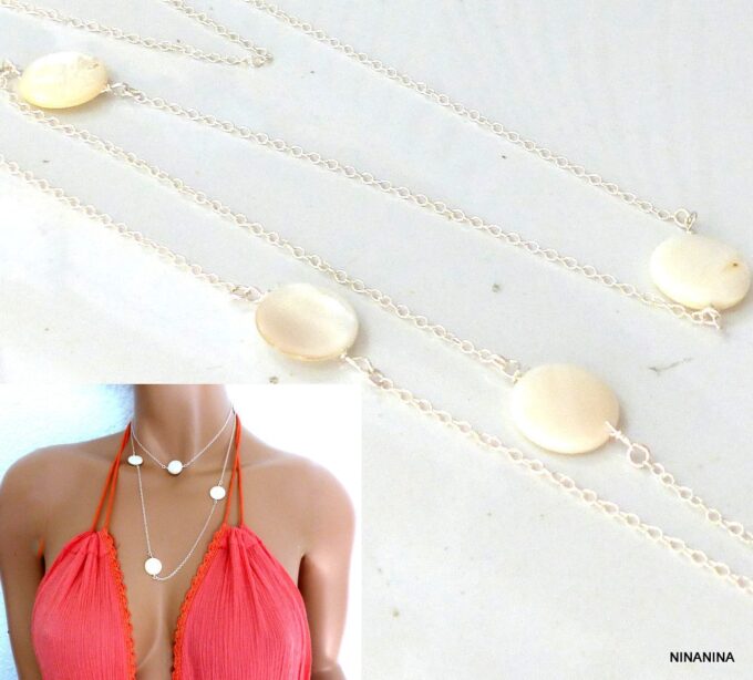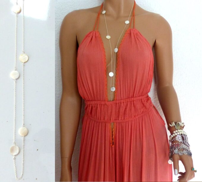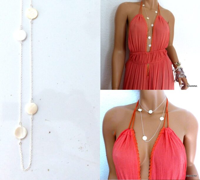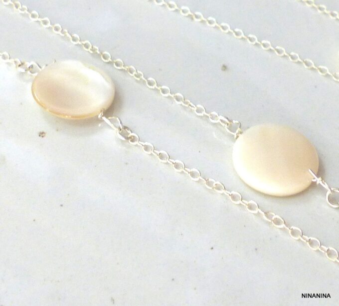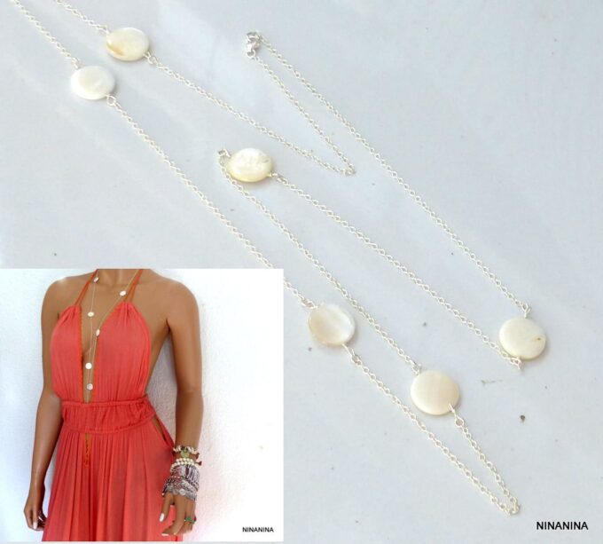 Collier femme long – sautoir argent massif nacre blanche composé de palets ronds en nacre montés sur une chaînette en argent 925.
