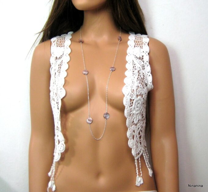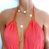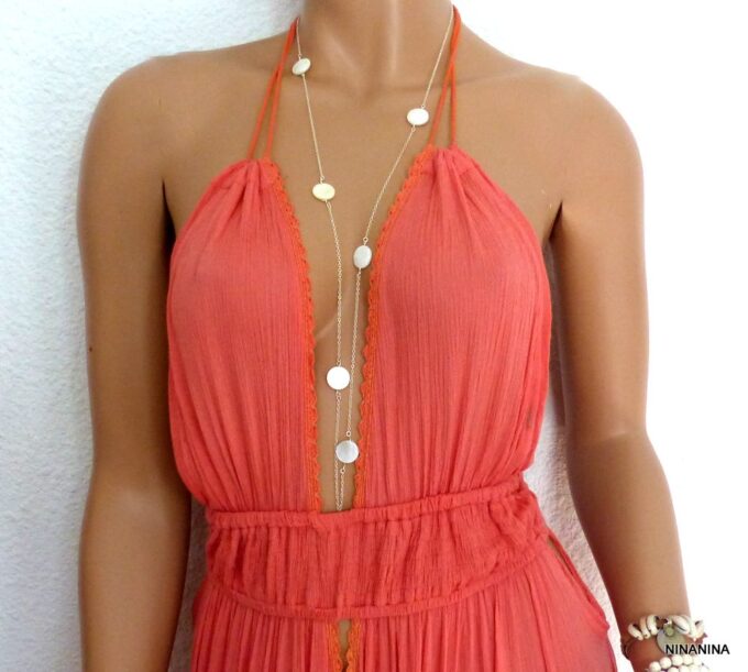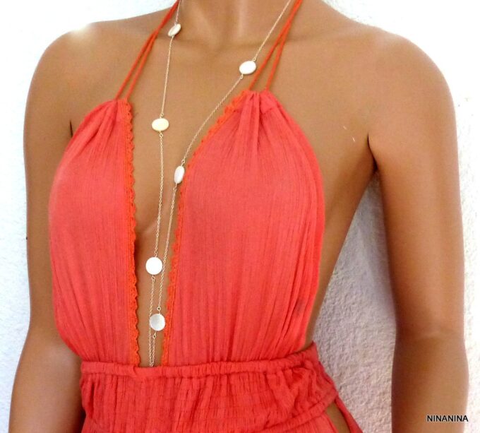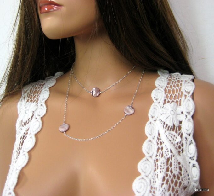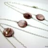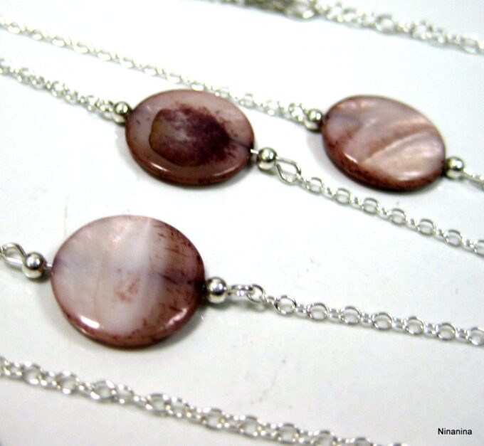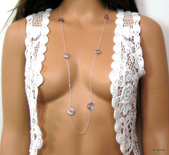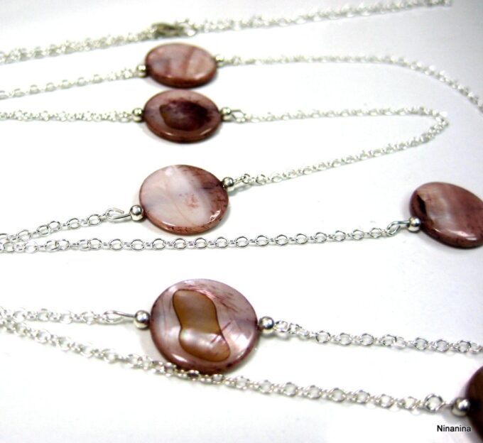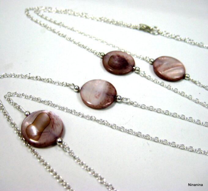 Collier femme long – sautoir argent massif nacre blanche composé de palets ronds en nacre montés sur une chaînette en argent 925.