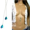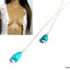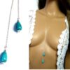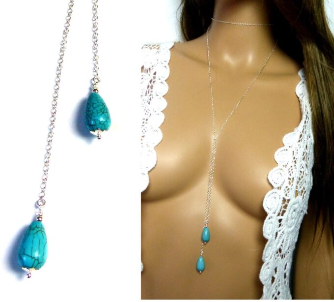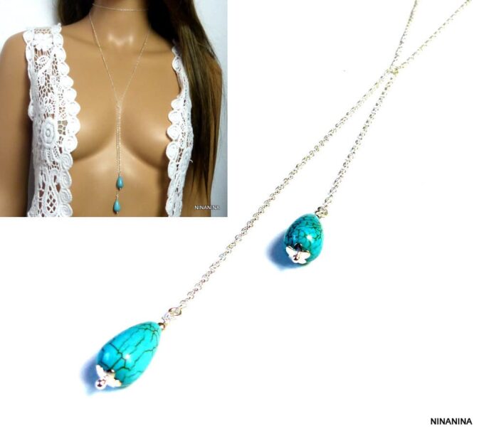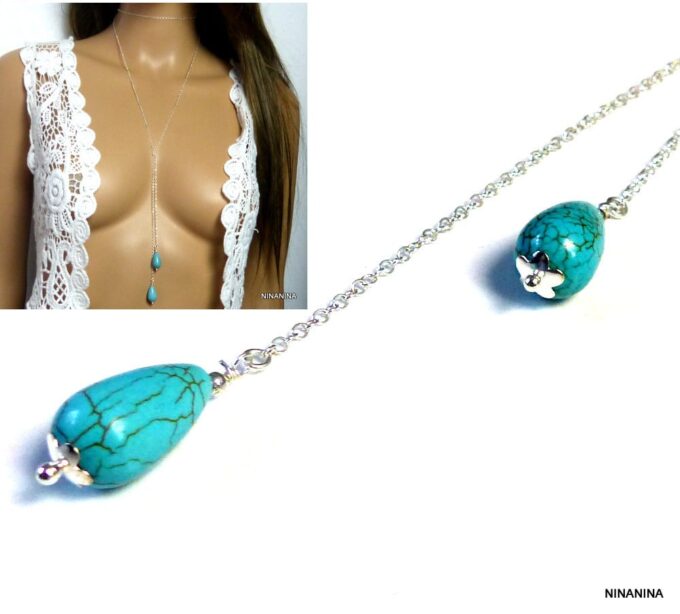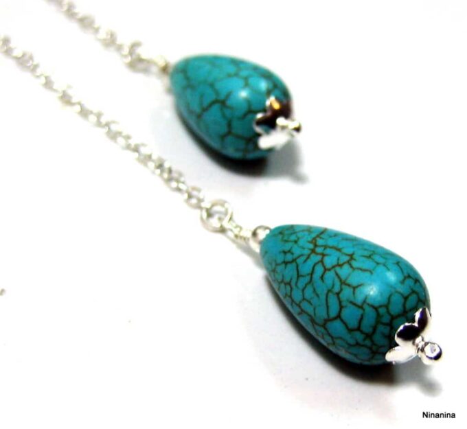 Collier long sautoir pendentifs turquoises argent massif composé de deux pendentifs gouttes en magnesite turquoise montés sur une chaînette (1mm de diamètre) en argent 925 à enrouler autour du cou.