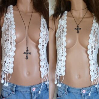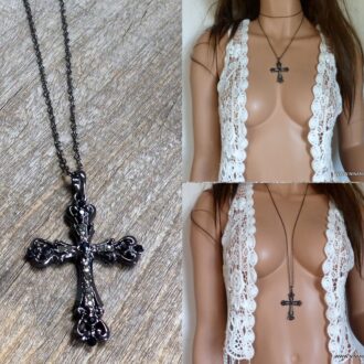 Sautoir Croix Grand Pendentif Strass Et Long Collier Femme composé d’un pendentif grande taille en métal argenté et strass monté sur chainette en acier inoxydable.