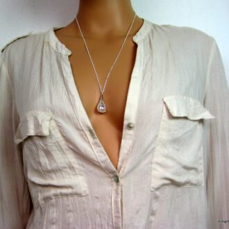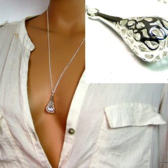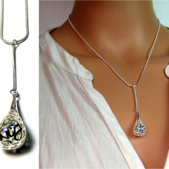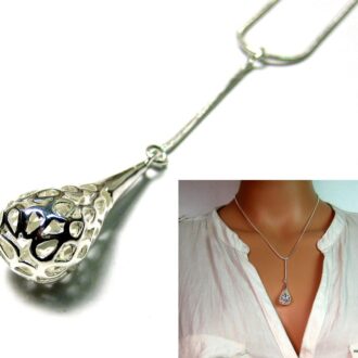 Collier long sautoir goutte en plaqué argent composé d’un pendentif goutte filigrané en plaqué argent monté sur une chainette boule en plaqué argent. Dim du pendentif: 3,5 X 1,5 cm. Longueur (fermoir compris) : 76 cm environ. Peut se porter long ou court (2 tours). Fermoir mousqueton. Livrées dans sa pochette d’organza. Poids : 6,2 g
