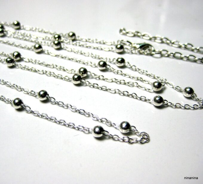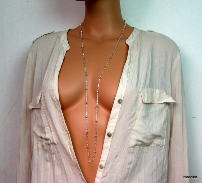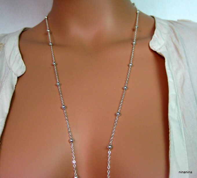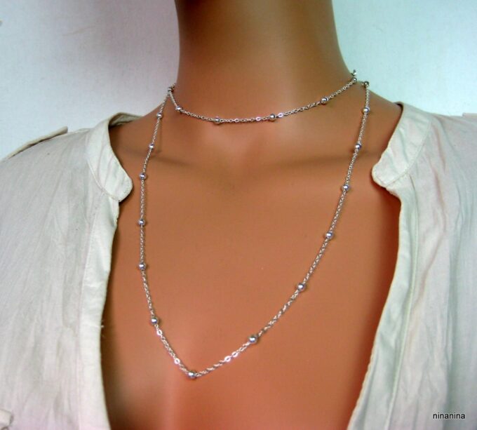 Collier Fantaisie long sautoir perles Acier Inoxydable argenté composé de petites perles rondes montées en alternance sur une fine chainette en acier inoxydable argenté.  Diamètre des perles : 0,4 cm. Fermoir mousqueton. Longueur (fermoir compris) : 100 cm environ TOUTE AUTRE LONGUEUR POSSIBLE). Livré dans sa pochette d’organza.