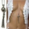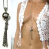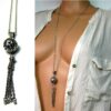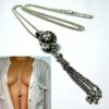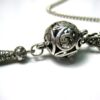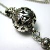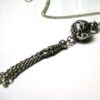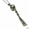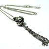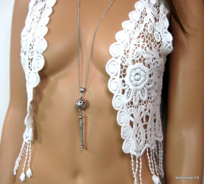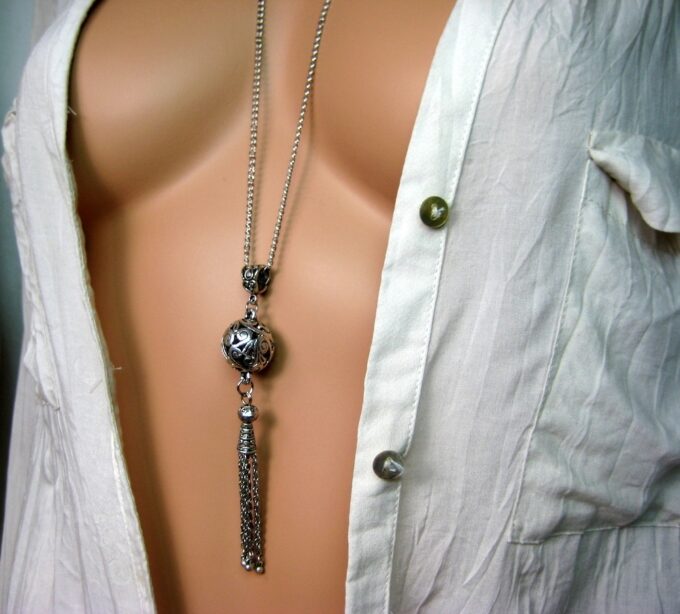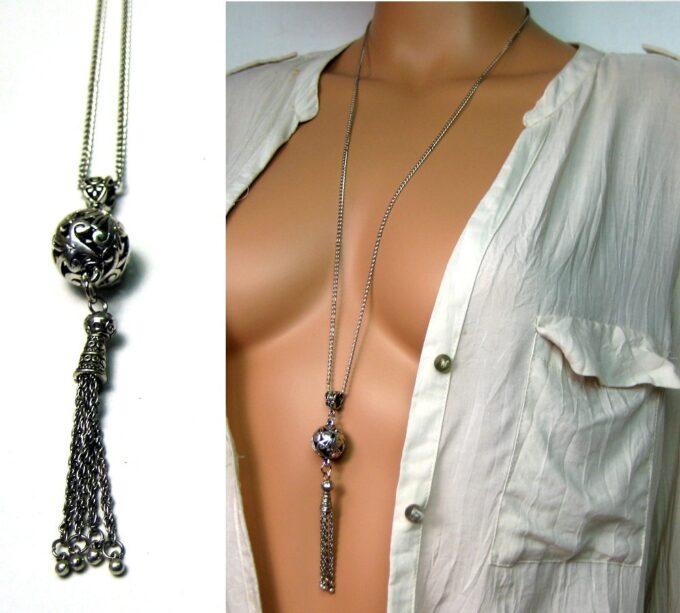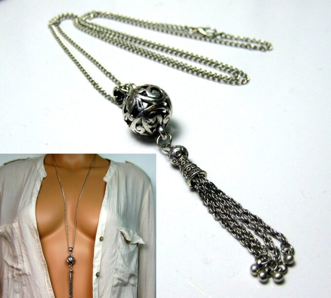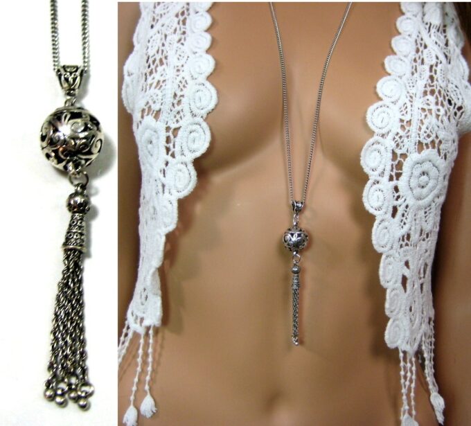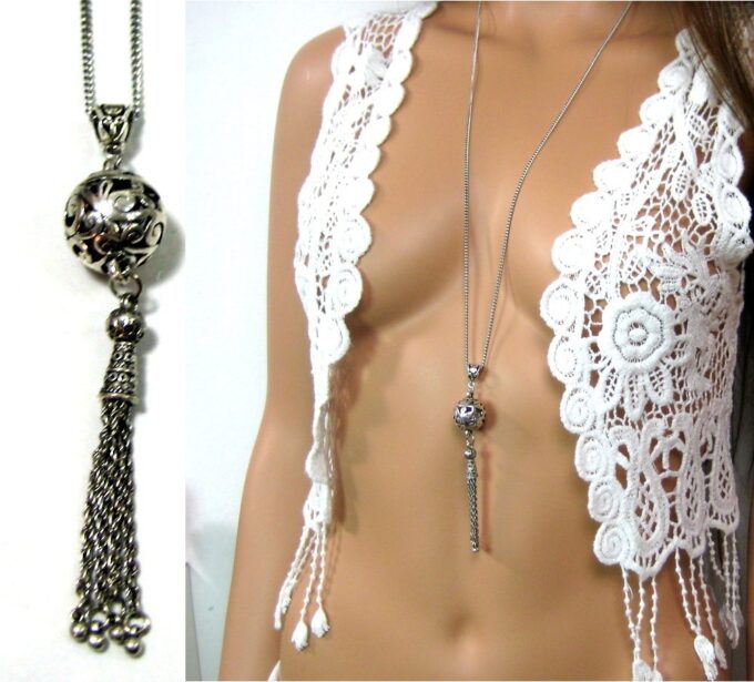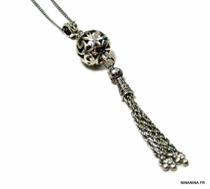 Collier long – sautoir pompon métal argenté composé d’une boule ciselée et d’un pompon en métal argenté montés sur une chaine en acier inoxydable. Dim de la perle : 2,6 X 1,8 cm. Longueur du pompon : 6 cm env. Longueur : fermoir compris : 80 cm env. Fermoir mousqueton. Livré dans sa pochette d’organza