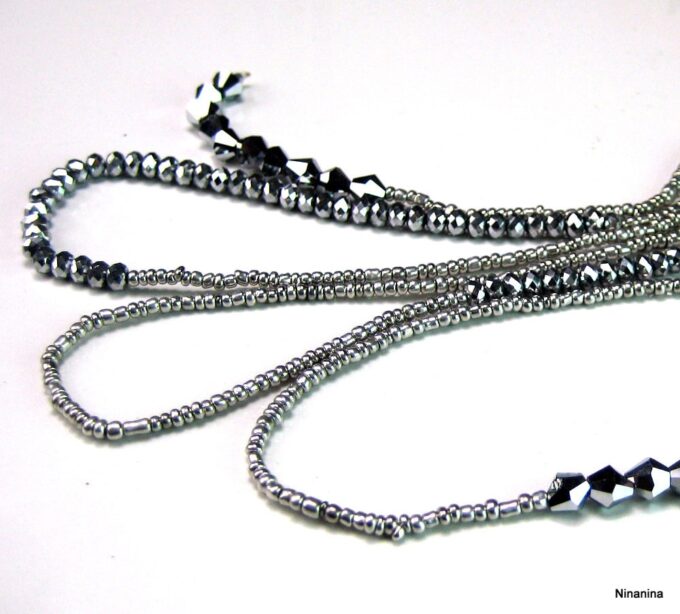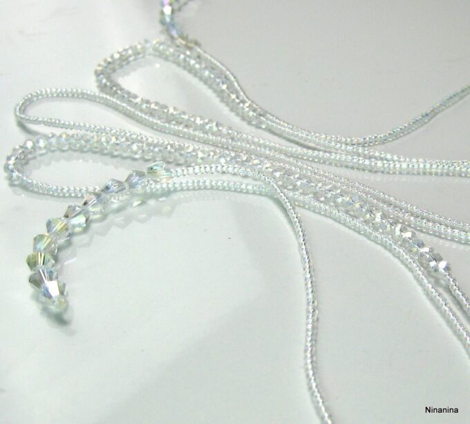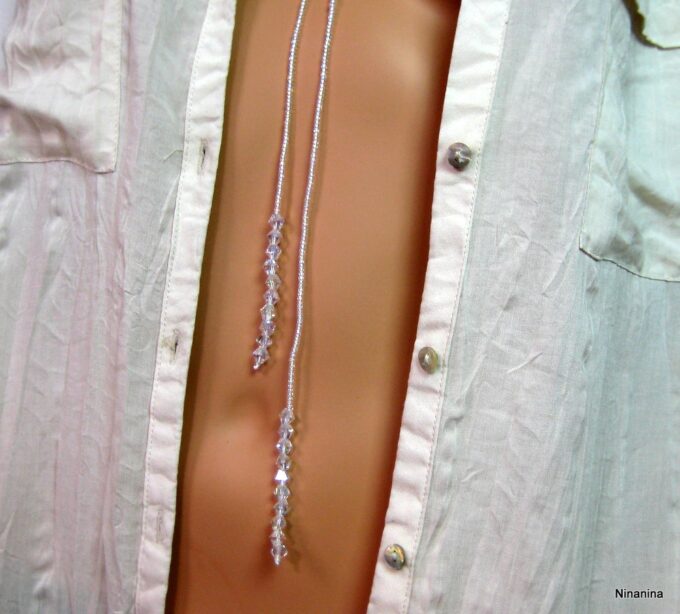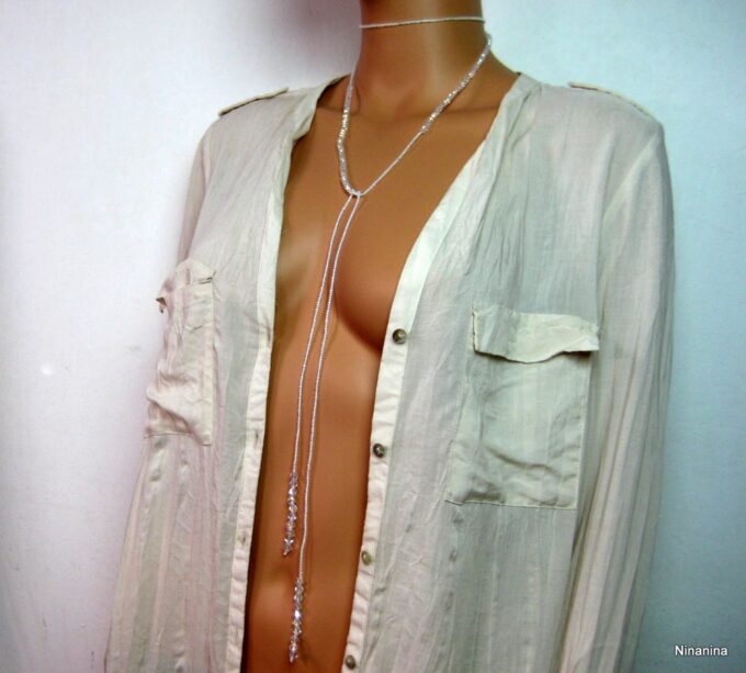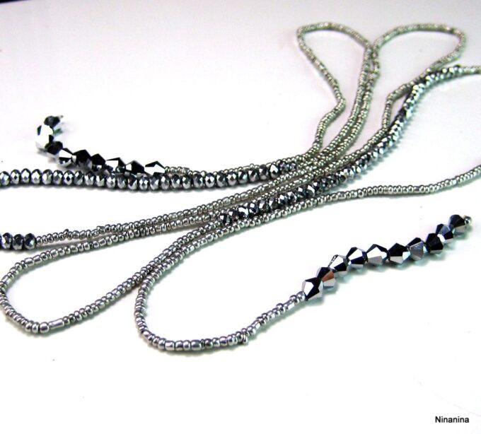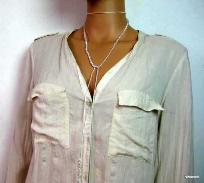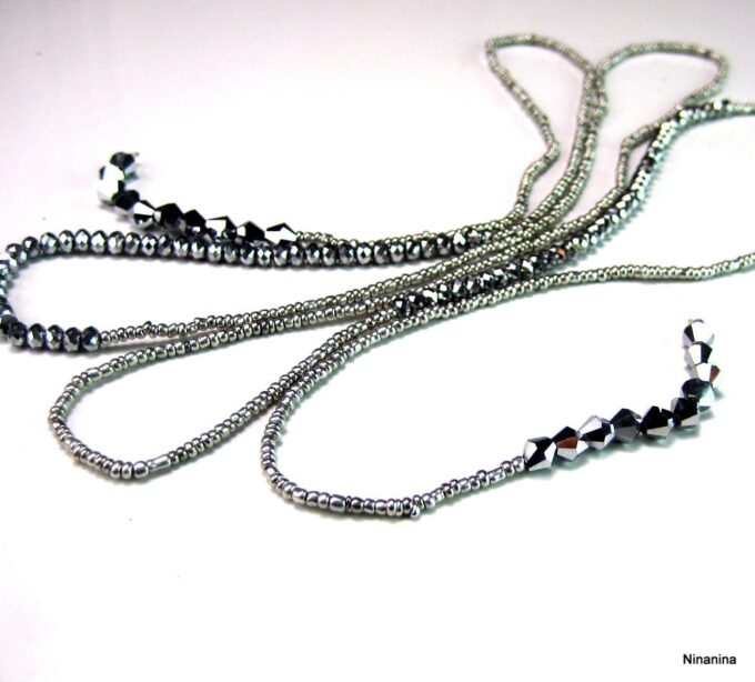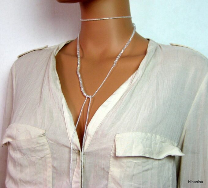Collier long sautoir composé de perles de rocailles et de perles bicones blanches à enrouler autour du cou. Longueur totale : 145 cm. Existe aussi en gris. Fermeture par un n?ud pendant. Livré dans sa pochette d’organza.