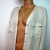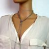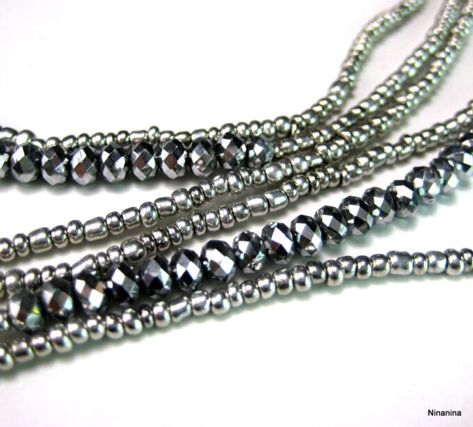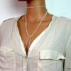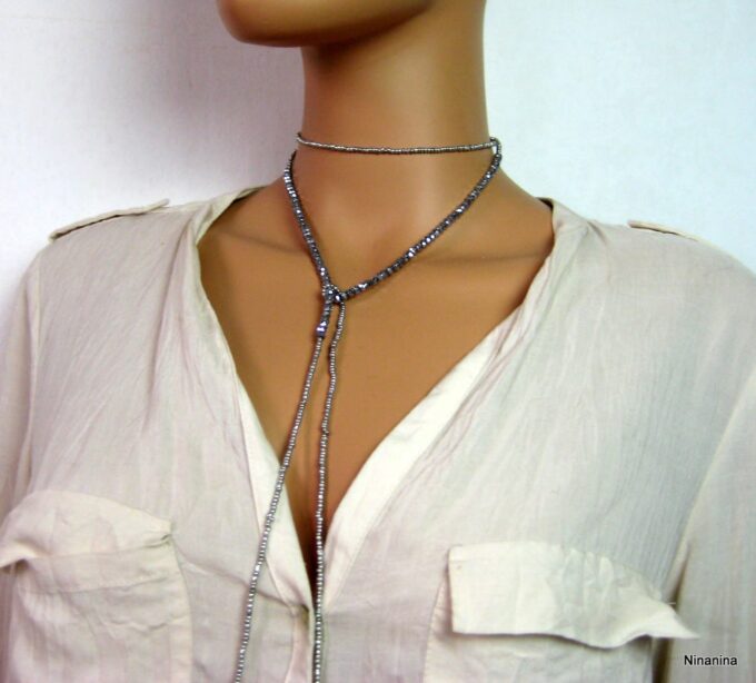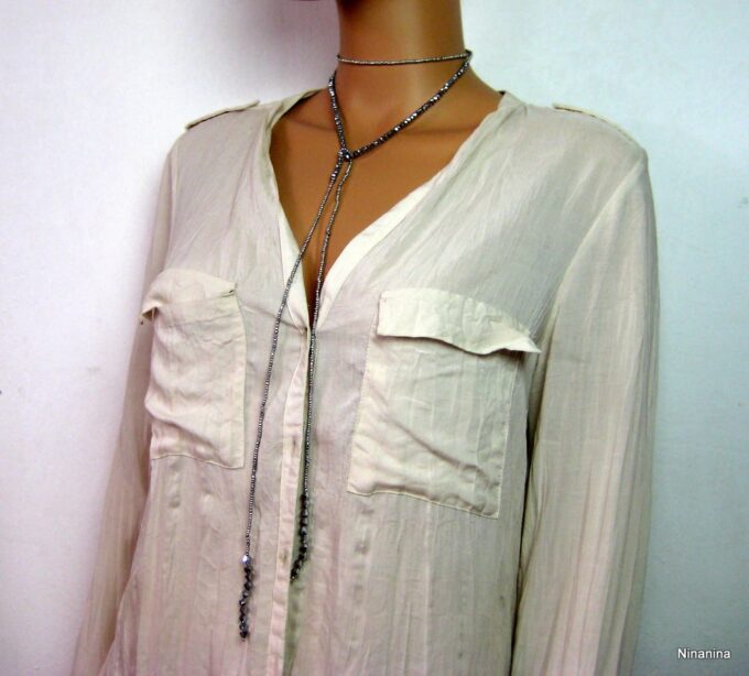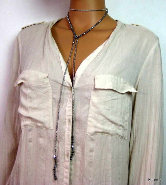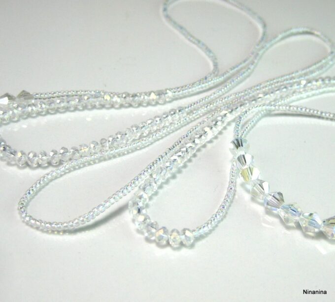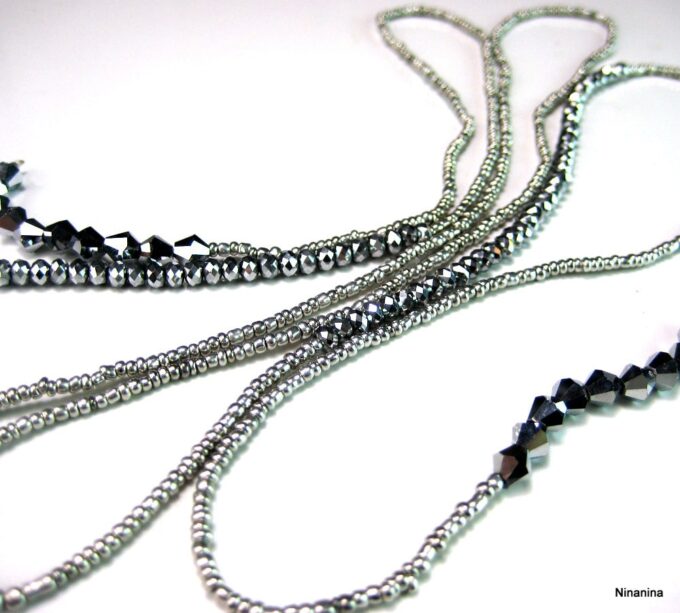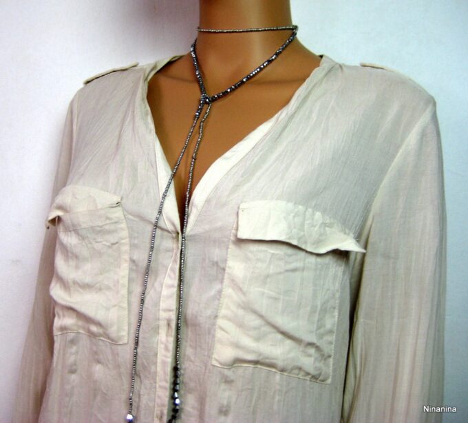 Collier long sautoir composé de perles de rocailles et de perles bicones blanches à enrouler autour du cou. Longueur totale : 145 cm. Existe aussi en gris. Fermeture par un n?ud pendant. Livré dans sa pochette d’organza.
