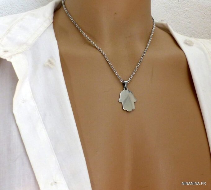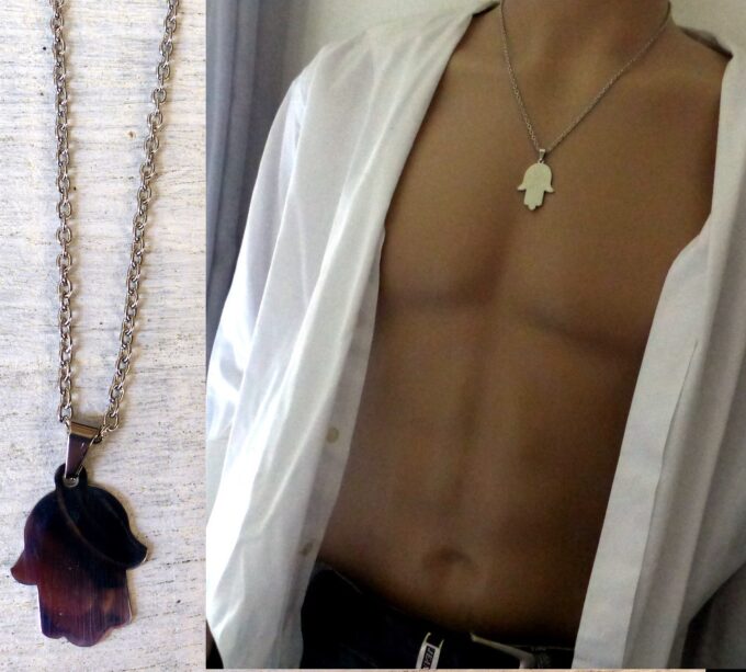 Ce collier main de fatma homme en Acier de haute qualité est fabriqué à la main, de façon artisanale et en série limitée dans notre atelier du sud de la France. Subtil alliage de plusieurs éléments (le fer, le nickel ou le chrome), l’Acier inoxydable est un matériau particulièrement prisé pour ses nombreuses vertus. Il est très solide et robuste, totalement hypoallergénique, ne rouille pas et, contrairement à l’Agent, ne s’oxyde pas.