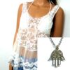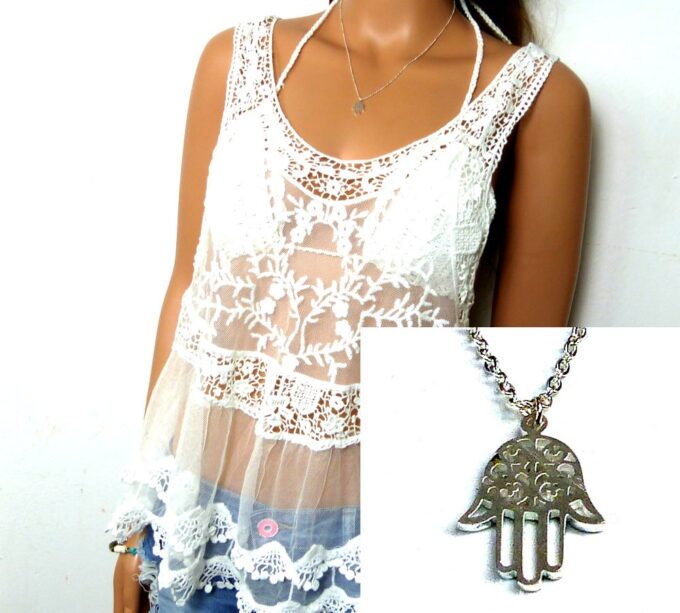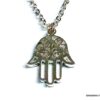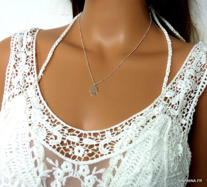 Collier main de fatma femme Acier inoxydable argent composé d’un pendentif main de fatma en acier inoxydable monté sur une chainette en acier inoxydable. Dim du pendentif : 1,7 X 1,4 cm. Fermoir mousqueton. Existe aussi en acier inoxydable doré. Longueur : 48 cm env. Livré dans sa pochette d’organza. Bijou 100% fait main.