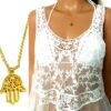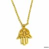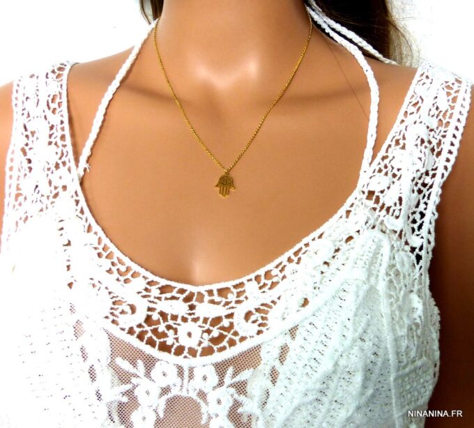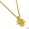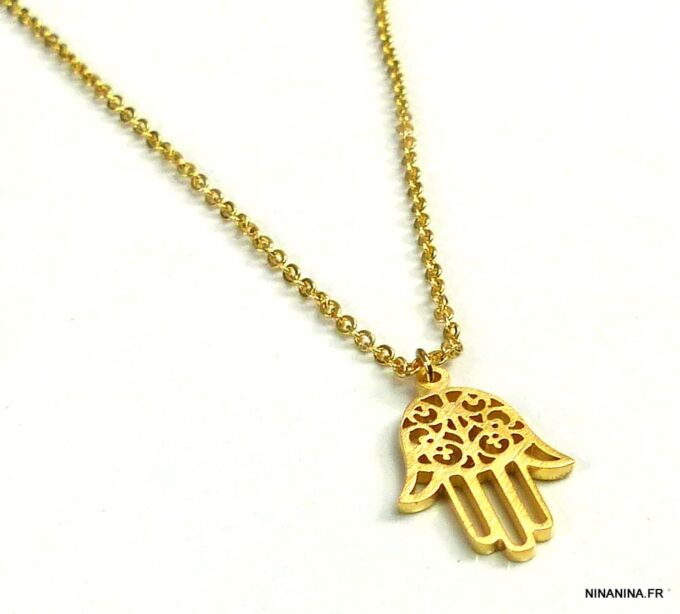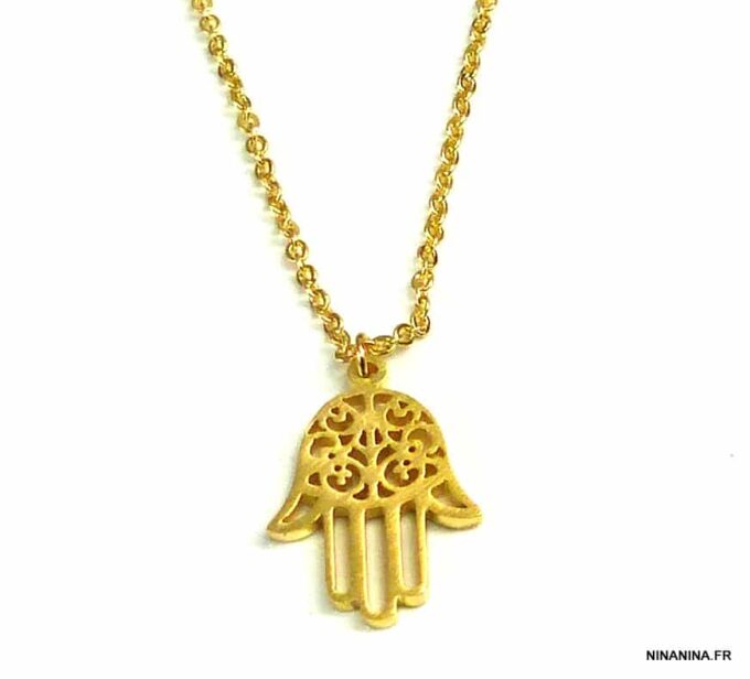 Collier main de fatma or femme Acier inoxydable doré composé d’un pendentif main de fatma en acier inoxydable monté sur une chainette en acier inoxydable. Dim du pendentif : 1,7 X 1,4 cm. Fermoir mousqueton. Existe aussi en acier inoxydable argenté. Longueur : 48 cm env. Livré dans sa pochette d’organza. Bijou 100% fait main.