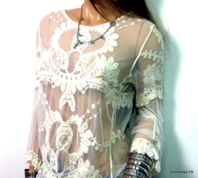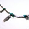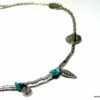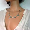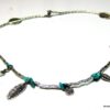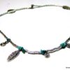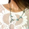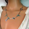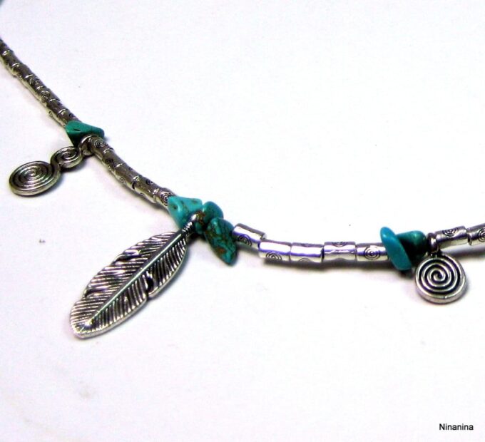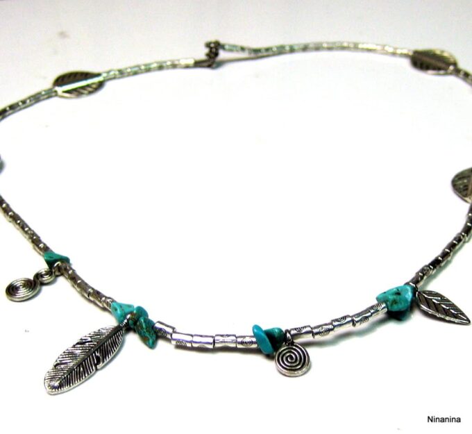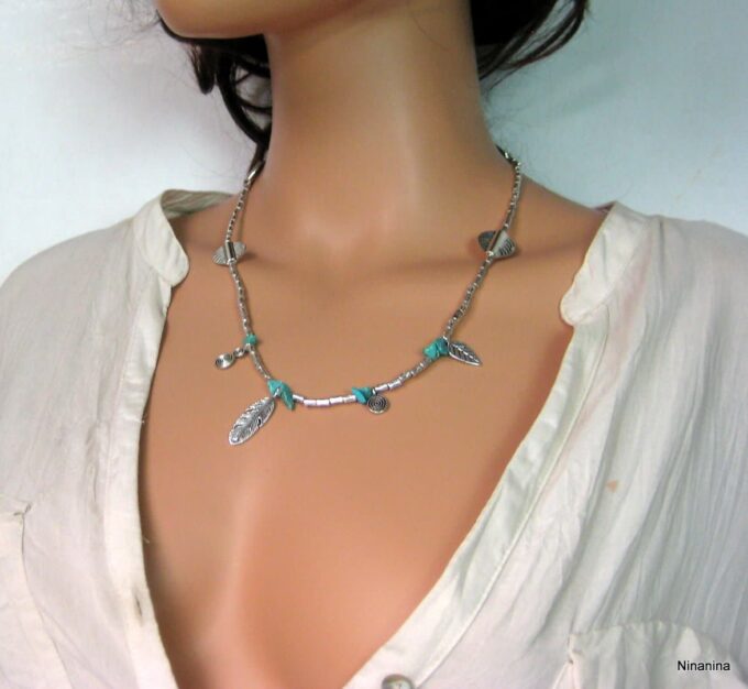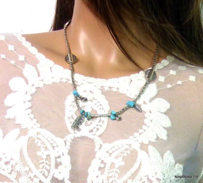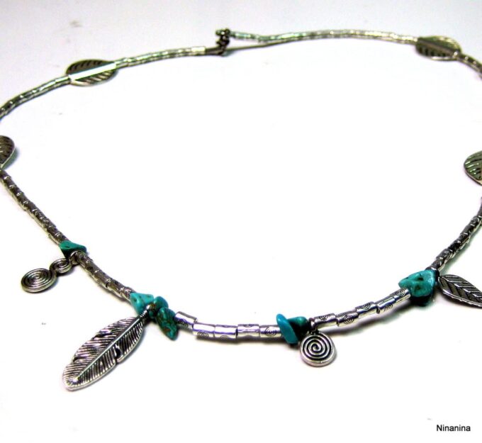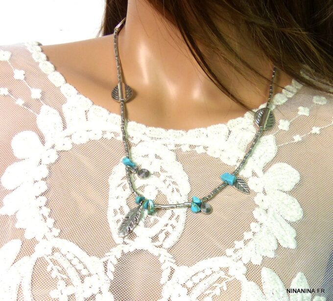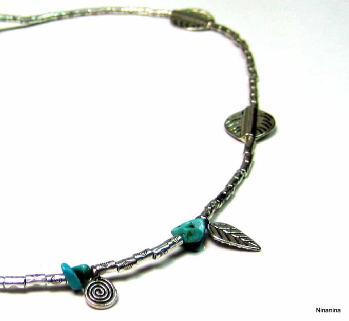 Collier long métal argenté et pierres turquoises composé de perles cylindriques et de breloques en métal argenté et de ships de verre turquoises montées sur un fil très solide, à enrouler autour du poignet (3 tours). Fermoir mousqueton et chainette de rallongement. Longueur totale (fermoir compris): 54 cm env. Livré dans sa pochette d’organza. Bijou 100% fait-main