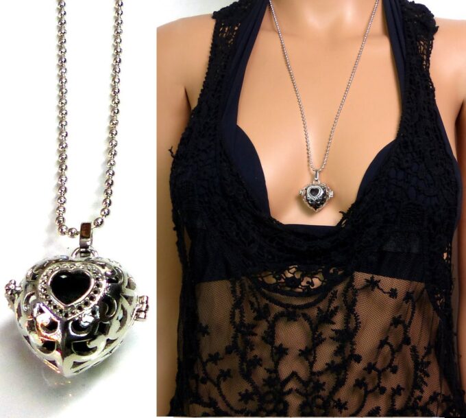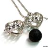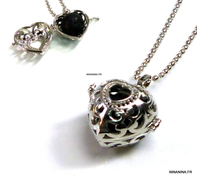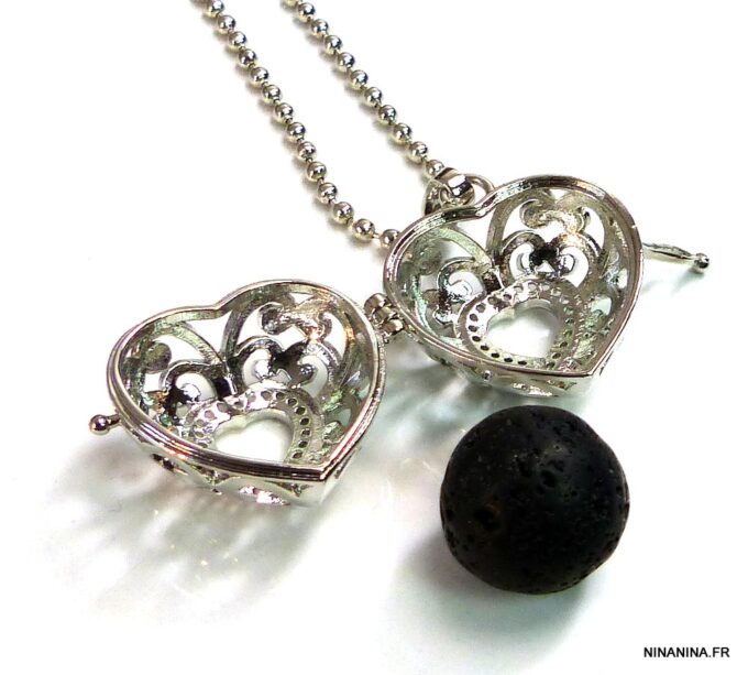 Vous en avez assez de ne plus sentir votre parfum une demie-heure après l’avoir pulvérisé ? Vous êtes adepte des huiles essentielles et vous aimeriez vous en imprégner tout au long de la journée ? Vous êtes enceinte et vous craignez de mettre votre parfum directement au contact de la peau ? Découvrez le Collier diffuseur de parfum ou d’huile essentielle coeur. ce collier parfum est composé d’un pendentif en forme de coeur filigrané diffuseur de parfum en métal argenté contenant une perle de lave noire à imbiber de parfum, monté sur fine chainette boule en métal argenté ! Il vous permet de diffuser votre parfum, tout au long de la journée, sans qu’il soit directement en contact avec votre peau.
