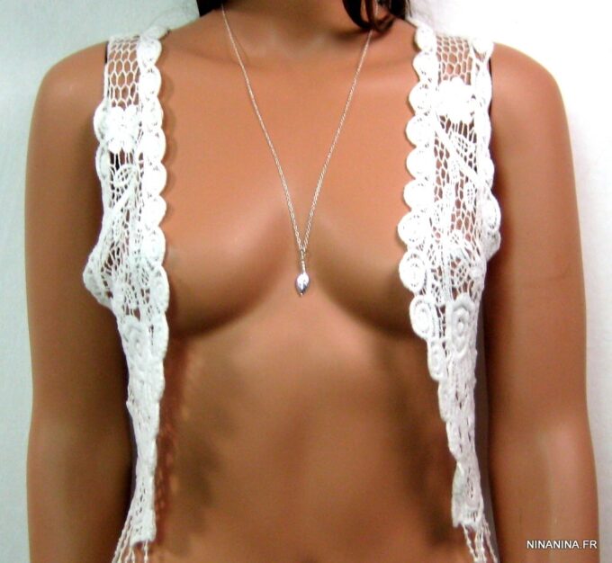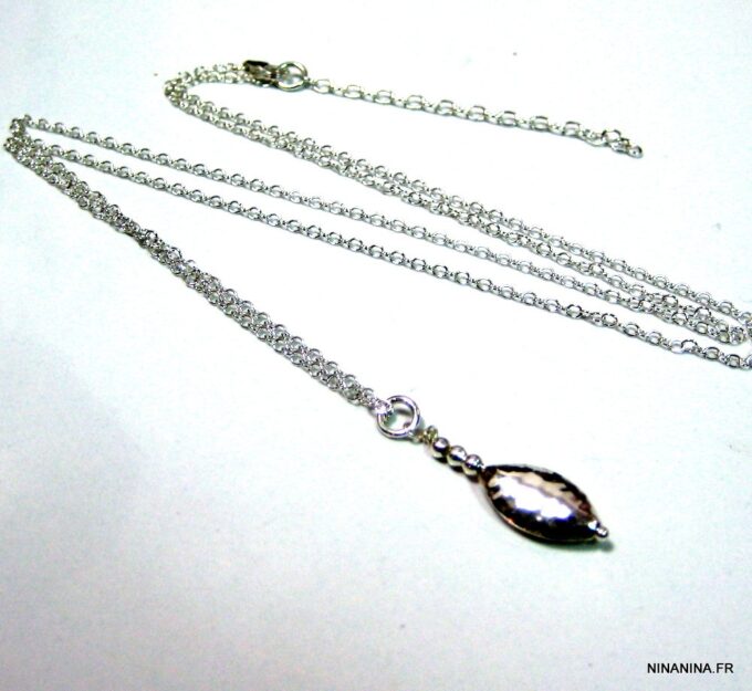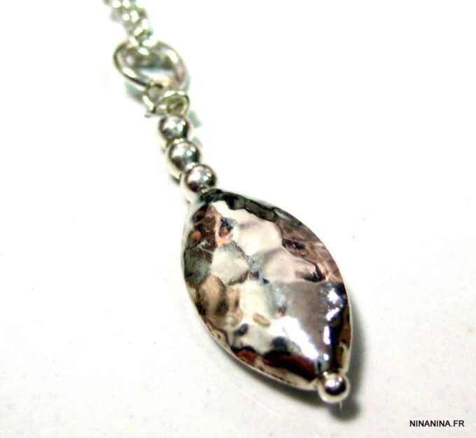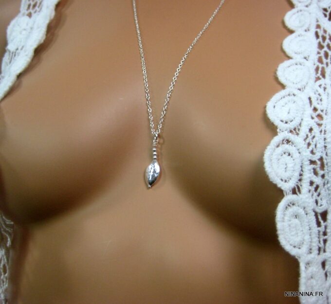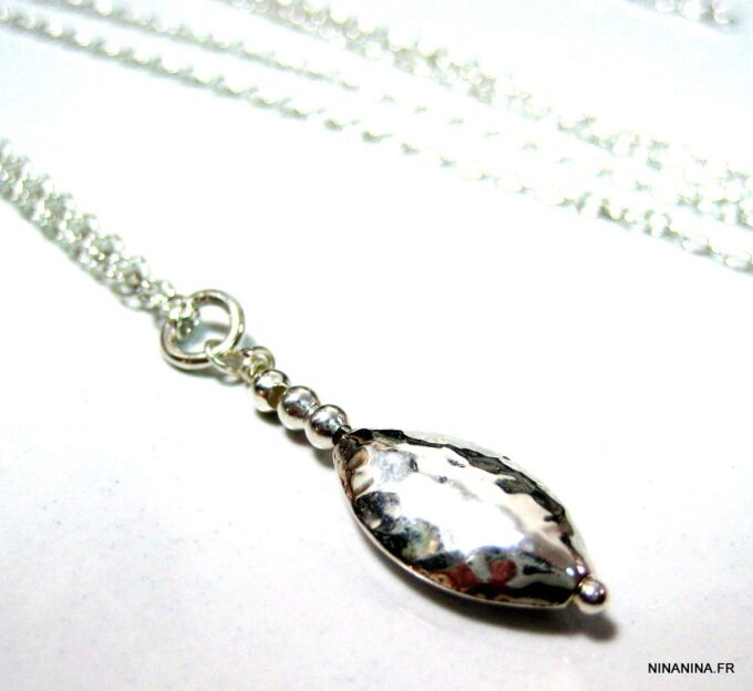 Collier mi-long en argent massif composé d’un pendentif ovoide et de petites perles rondes en argent 925 martelé montés sur une chaînette en argent 925. Dim du pendentif : 1,6 X 1 cm. Fermoir mousqueton en argent 925. Longueur (fermoir compris) : 65 cm Livré dans sa pochette d’organza. Poids : 3,8 g