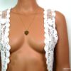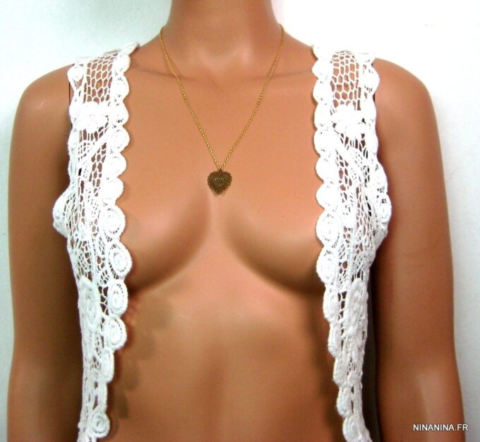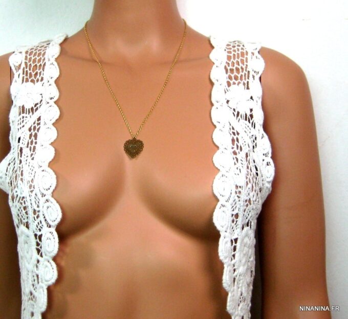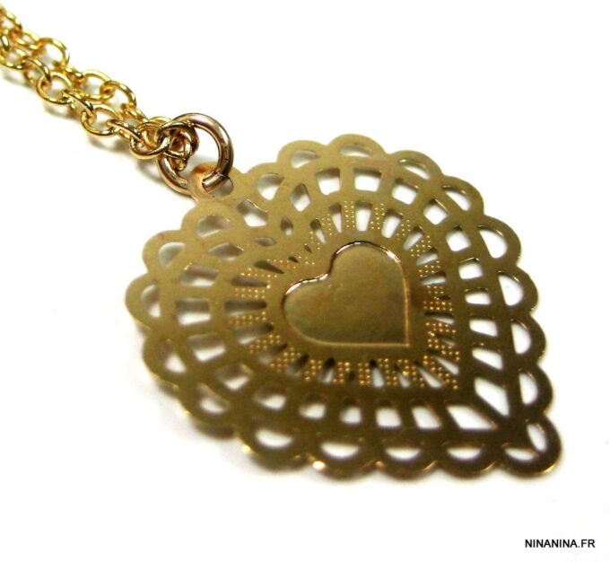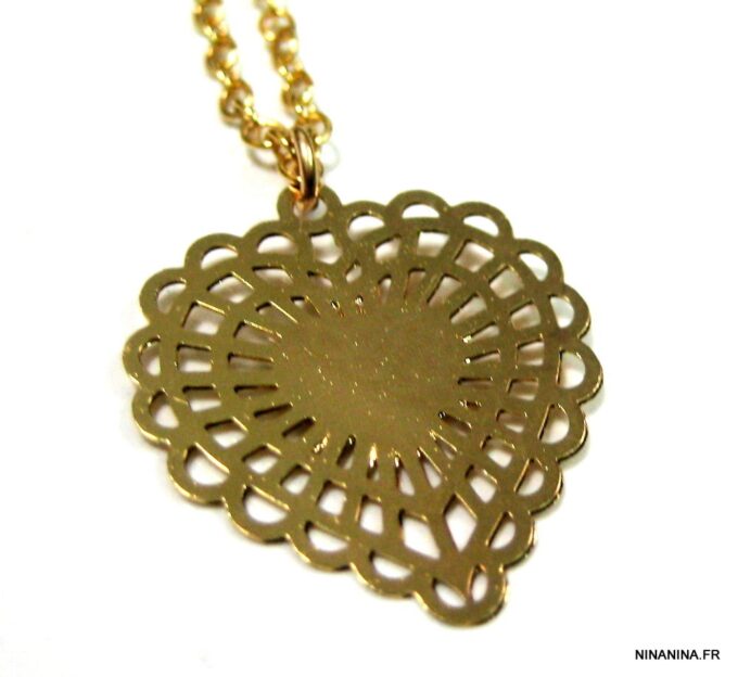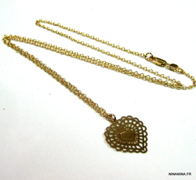 Collier mi-long coeur plaqué or composé d’un pendentif fin coeur en métal doré monté sur une chainette en métal doré. Dim du pendentif : 2,2 X 2 cm. Fermoir mousqueton. Longueur totale (fermoir compris): 55 cm env. Livré dans sa pochette d’organza. Bijou 100% fait main.