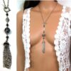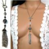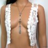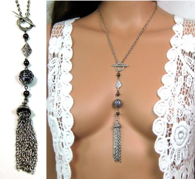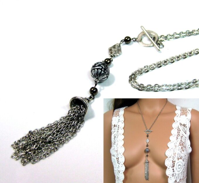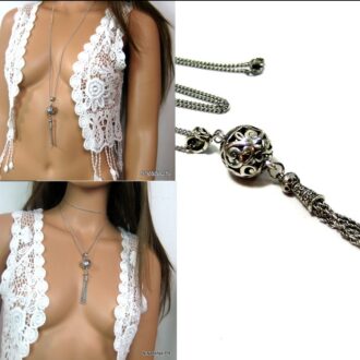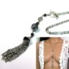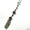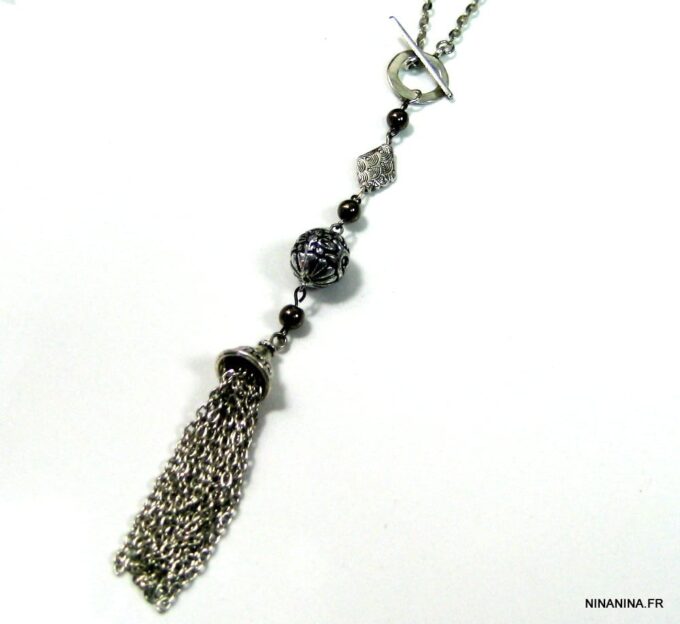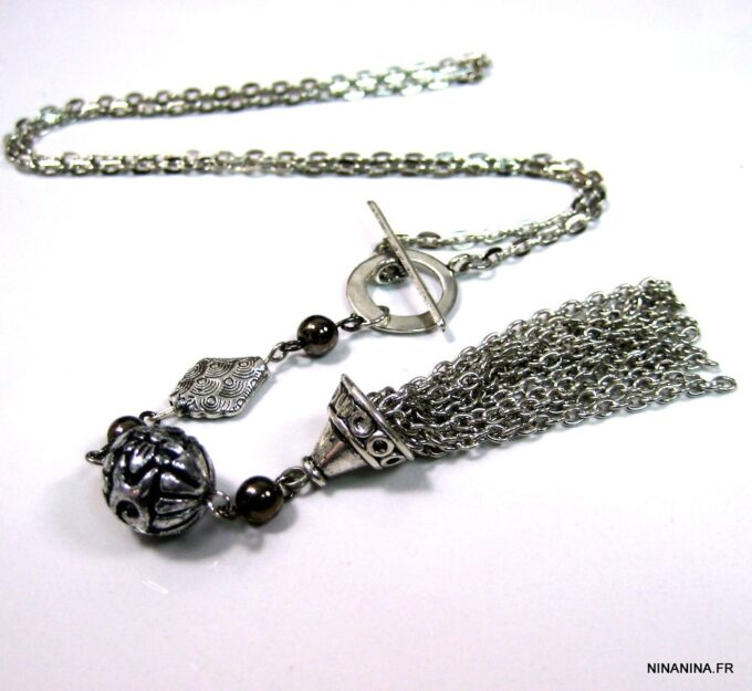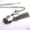 Collier métal argenté pompon composé d’une perle plate, d’une perle ronde ciselée, de 3 perles noires et d’un pompon en métal argenté montés sur chaine gourmette. Longueur : 50 cm environ. Fermoir cheville. Livré dans sa pochette d’organza. Bijou 100% fait-main.