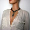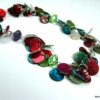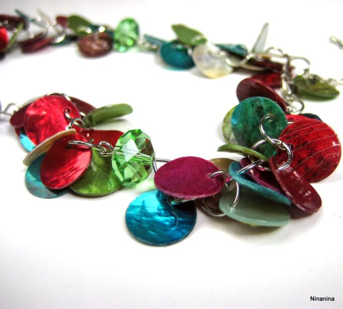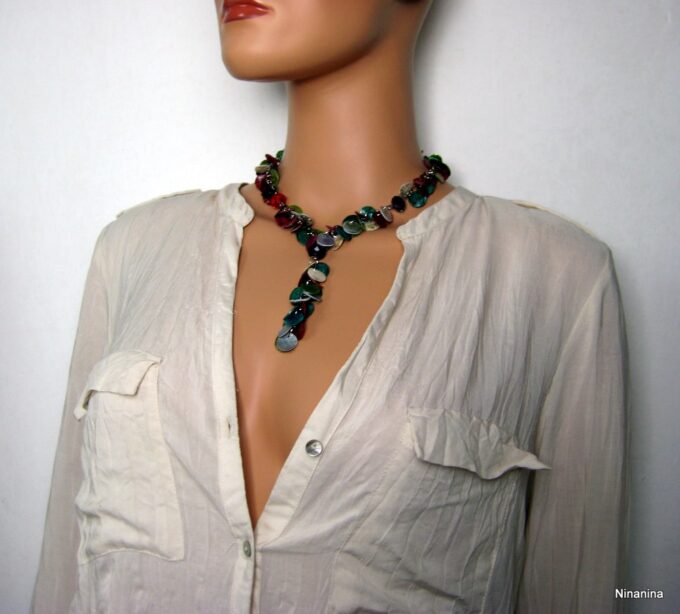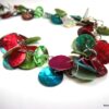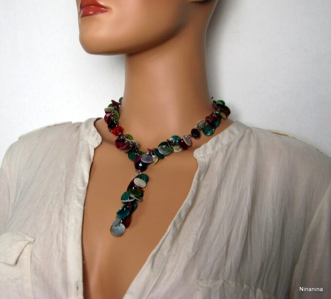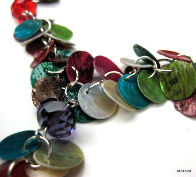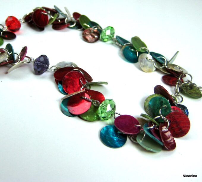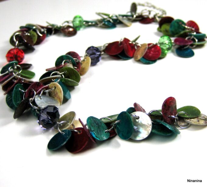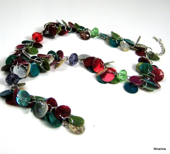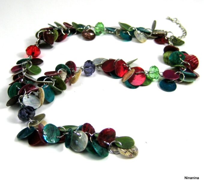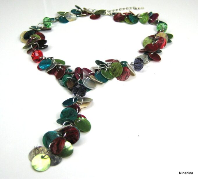 Collier Y nacre multicolore composé de sequins en nacre multicolores montés sur chainette en métal argenté. Longueur (fermoir compris): 42 cm environ. Fermoir mousqueton. Livré dans sa pochette d’organza.