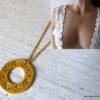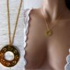 Cette pièce faite sur mesure convient pour la majorité des statures, la longueur proposée est de 46 + 5 cm de chainette de rallongement. Merci toutefois de laisser un commentaire si vous désirez une autre longueur. Diamètre : 2,6 cm. Ce collier karma est également disponible en acier argenté et or rose sur commande.