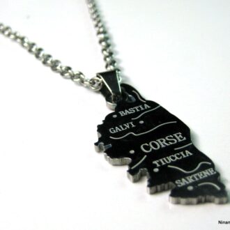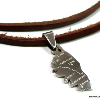 Collier homme cordon cuir CORSE acier argenté composé d’un pendentif CORSE en acier inoxydable monté sur un cordon de cuir noir (2 mm de diamètre).