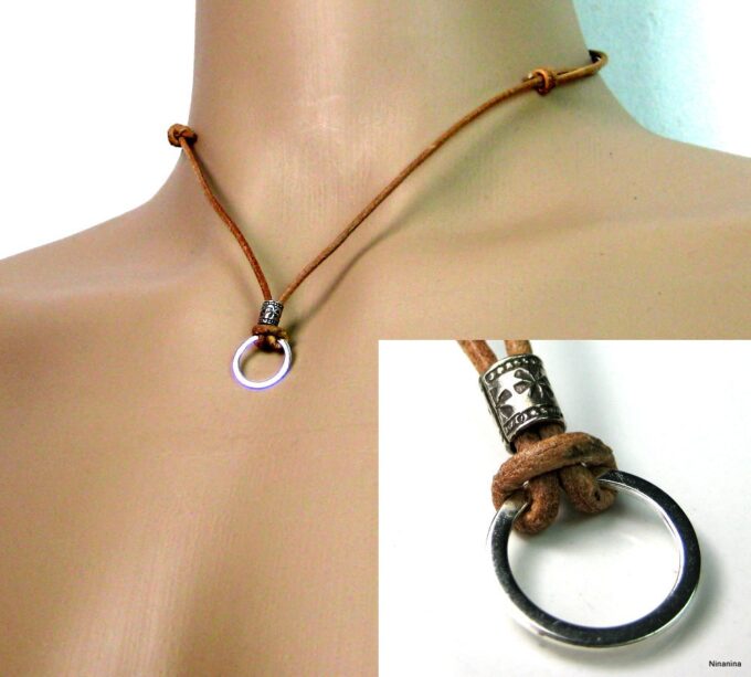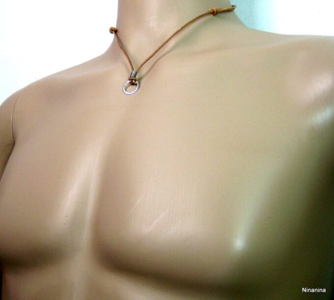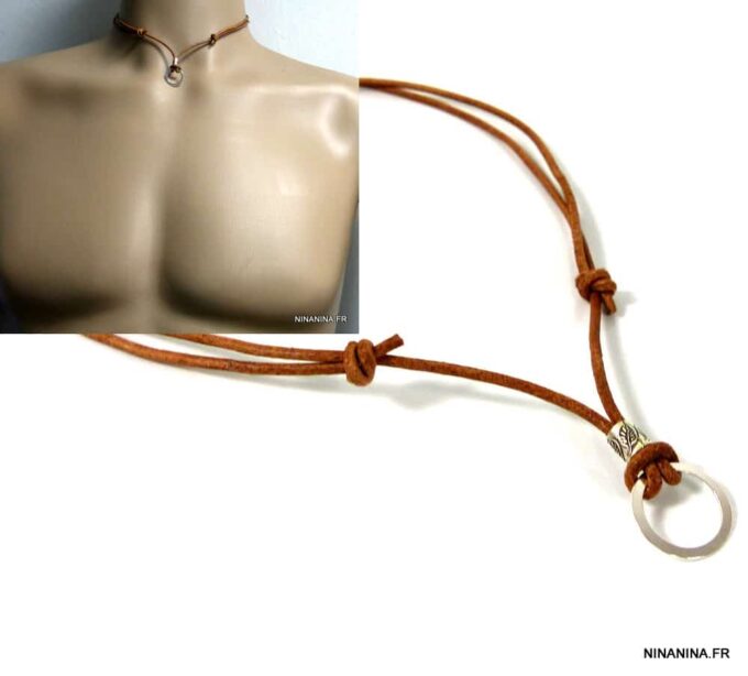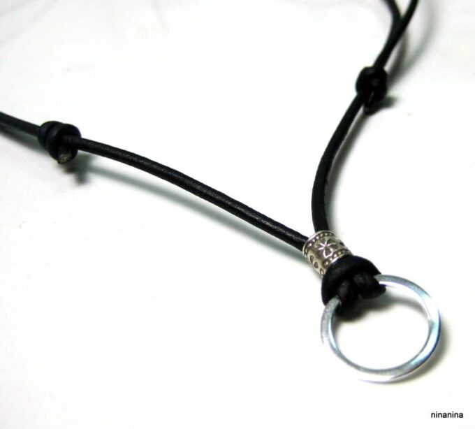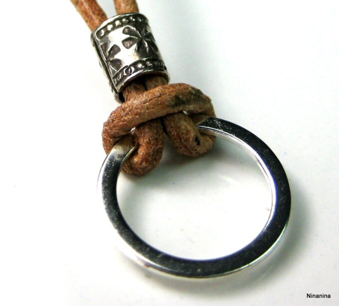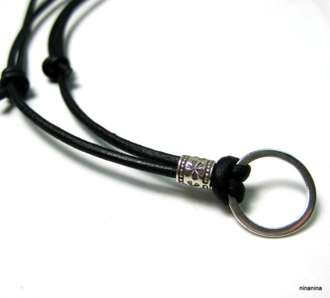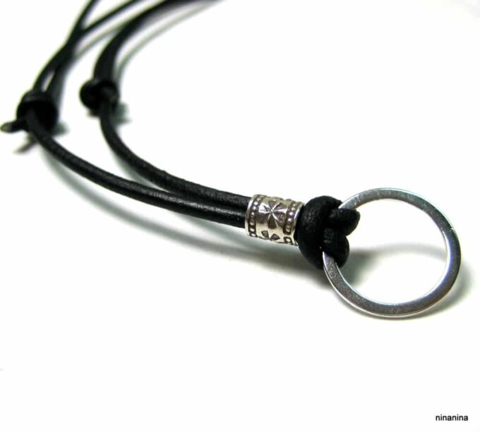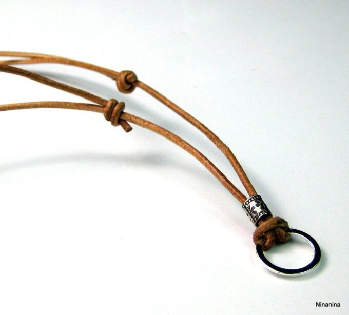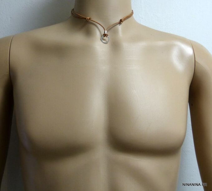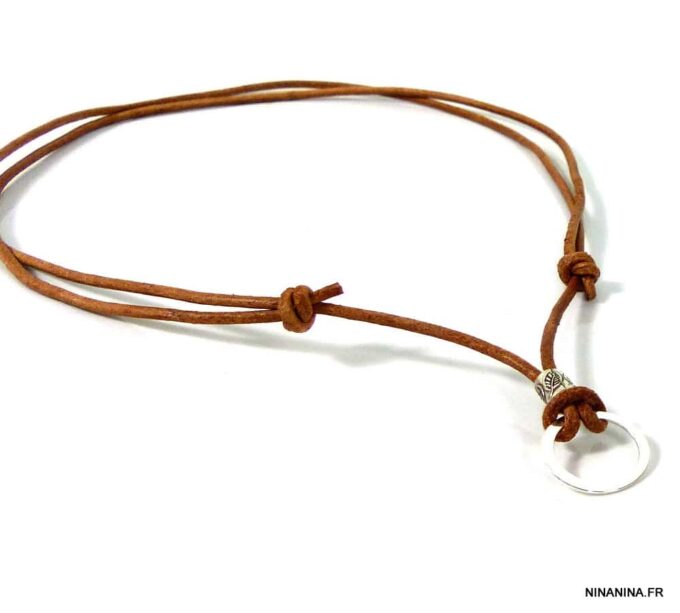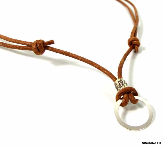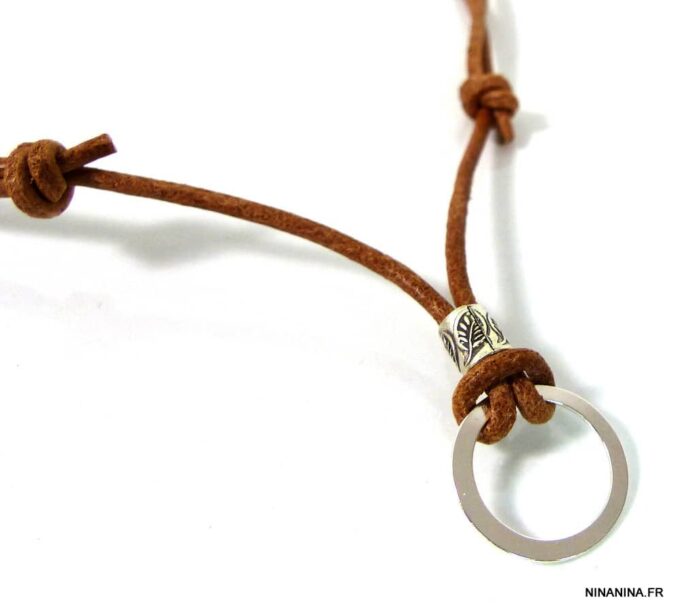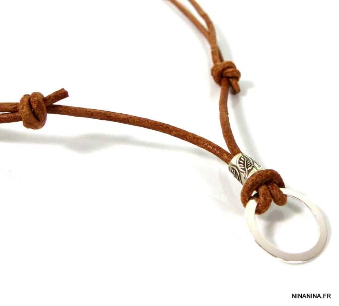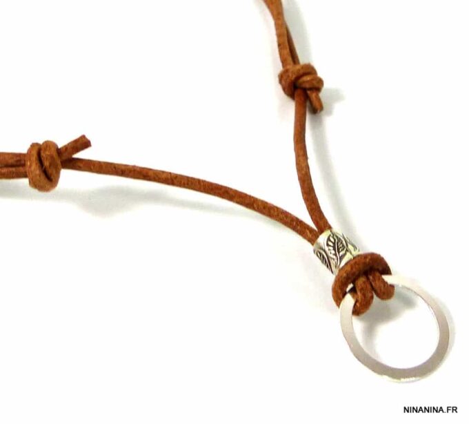 Collier homme cordon cuir anneau argent massif composé d’un anneau et d’une perle cylindrique ciselée en argent 925 montés sur un double cordon de cuir naturel.
