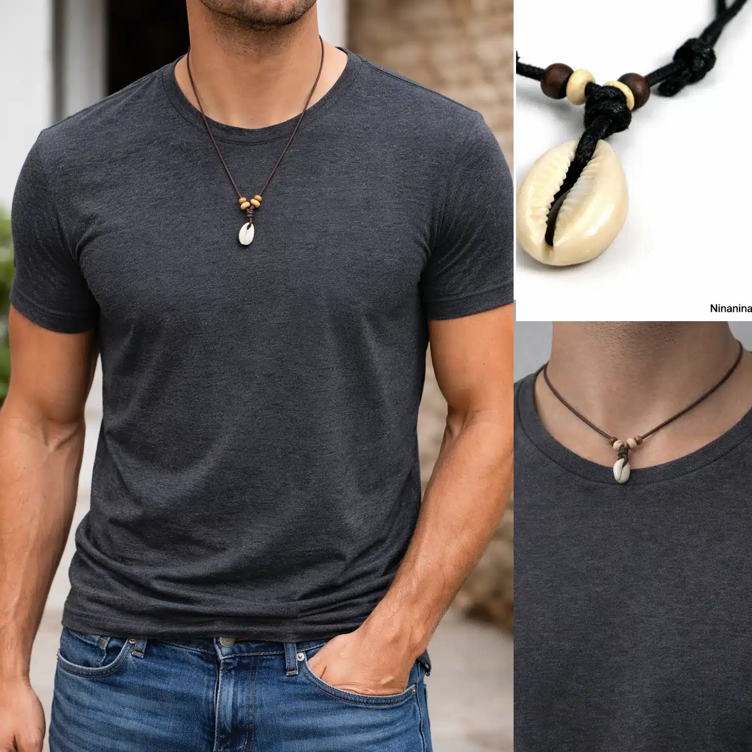 Soyez le premier à laisser votre avis sur “Collier coquillage cauri homme artisanal – perles bois et cordon réglable par liens coulissants”