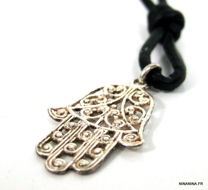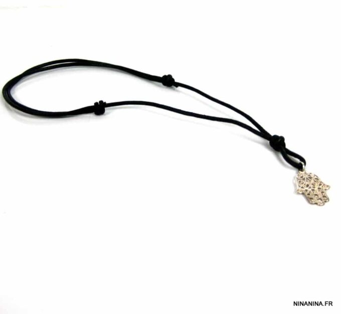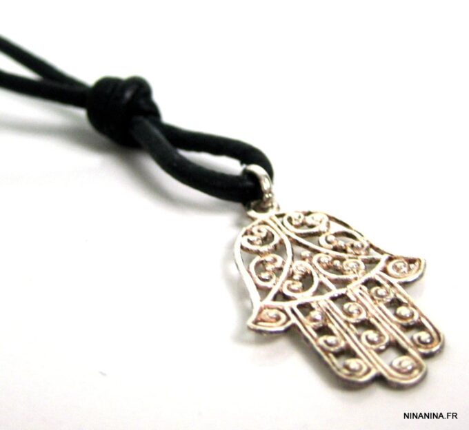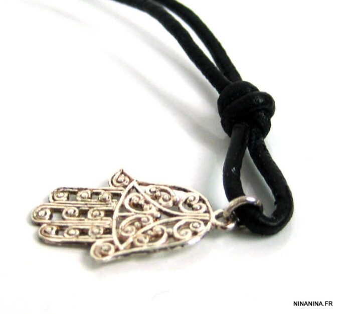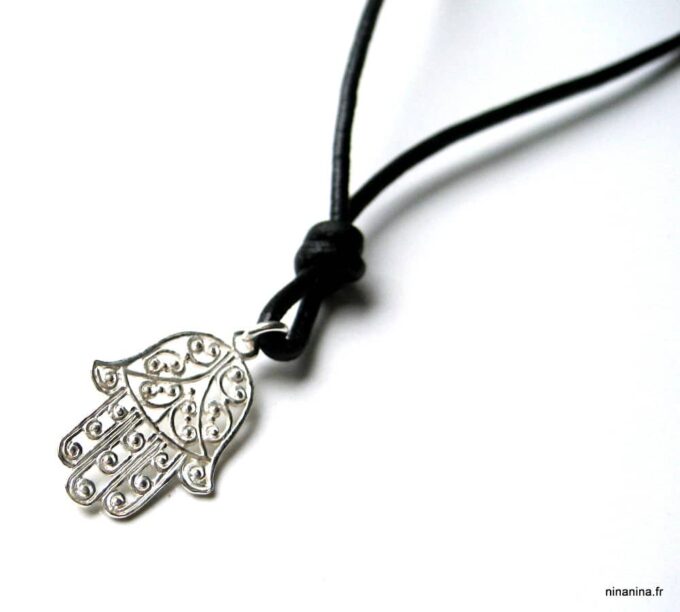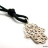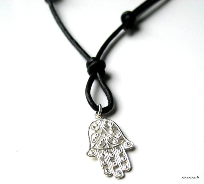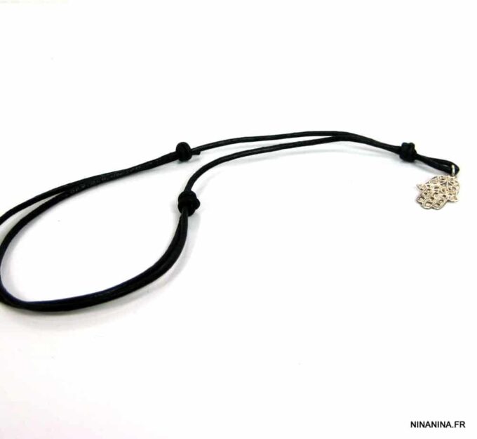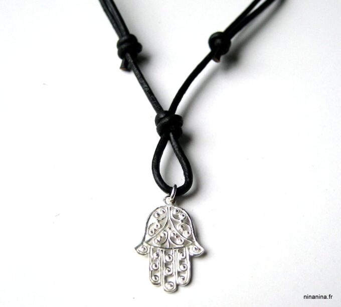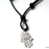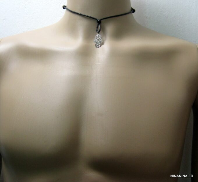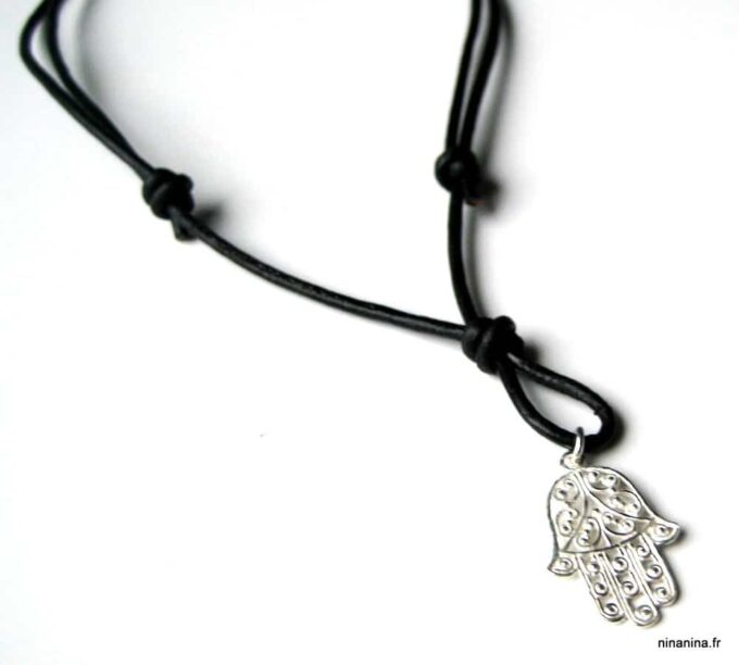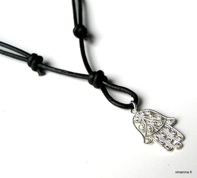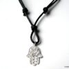 Collier Main de fatima homme Cordon Cuir Argent 925 massif composé d’un pendentif main de fatma ciselé en argent 925 monté sur un double cordon de cuir noir.