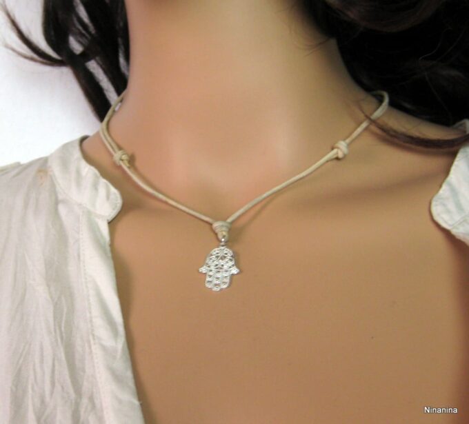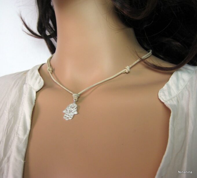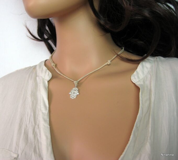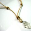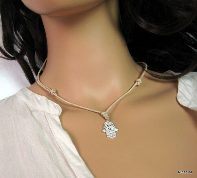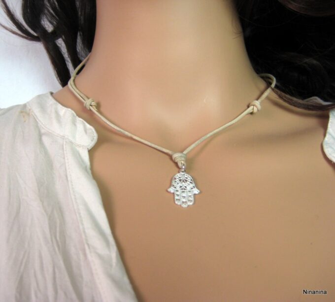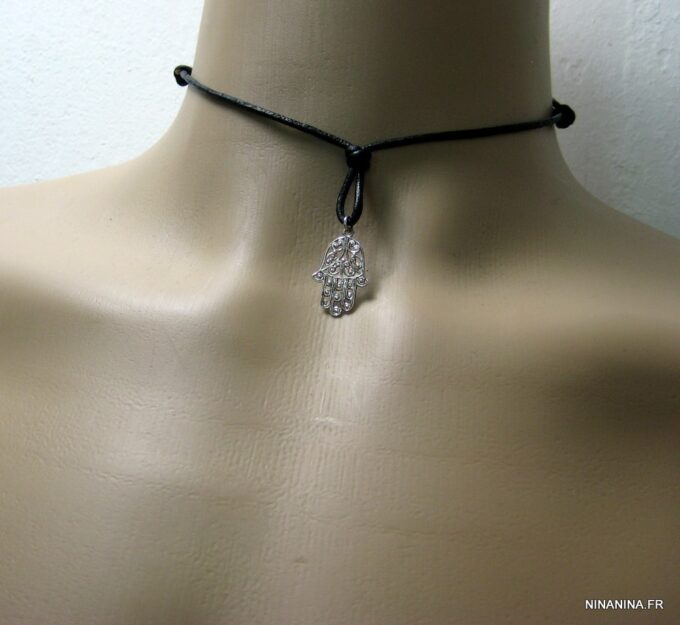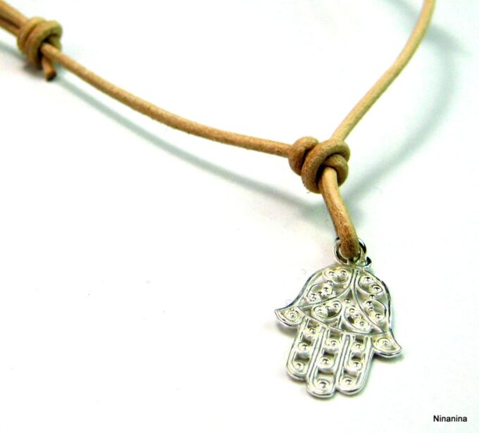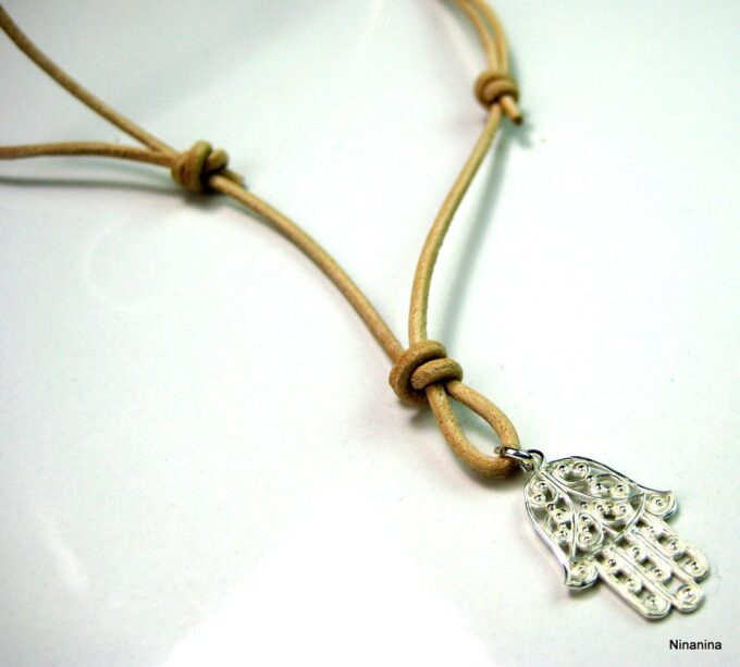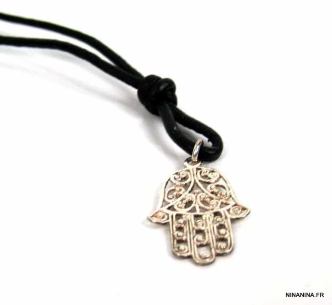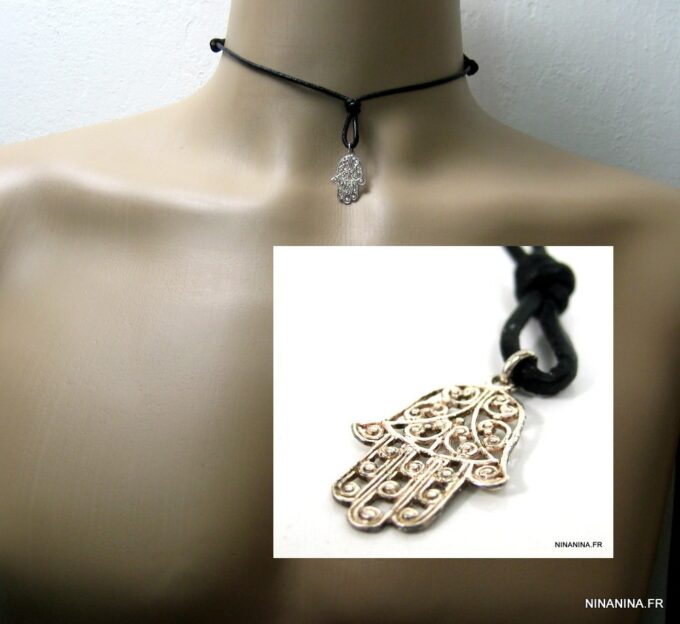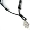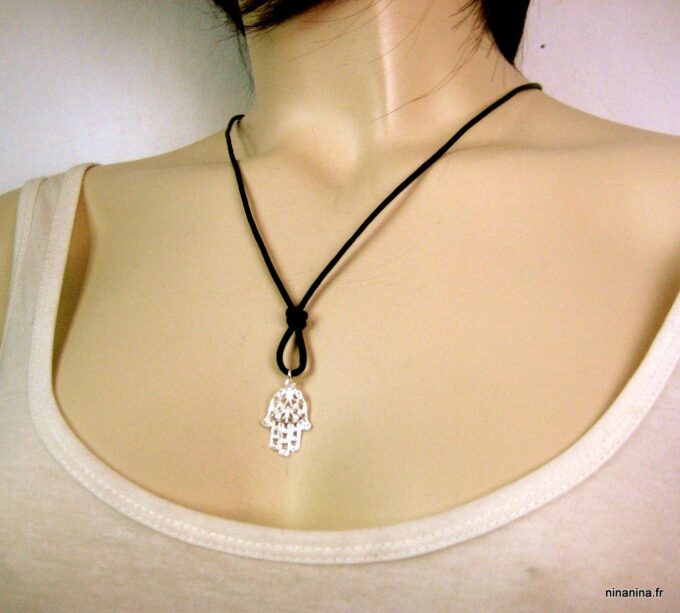 Collier Main de fatima homme Cordon Cuir Argent 925 massif composé d’un pendentif main de fatma ciselé en argent 925 monté sur un double cordon de cuir noir.