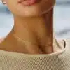 Avec une chemise blanche entrouverte, un top col rond, ou une robe fluide pour une élégance naturelle.