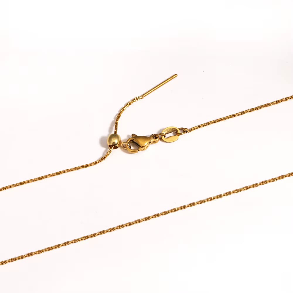La chaîne, d’une finesse travaillée, présente un maillage délicatement sculpté, offrant un équilibre parfait entre robustesse et élégance. L’acier doré confère une teinte chaude, légèrement satinée, qui reste éclatante dans le temps. Résistant à l’oxydation, il assure un bijou durable, idéal pour un usage quotidien ou des occasions spéciales.