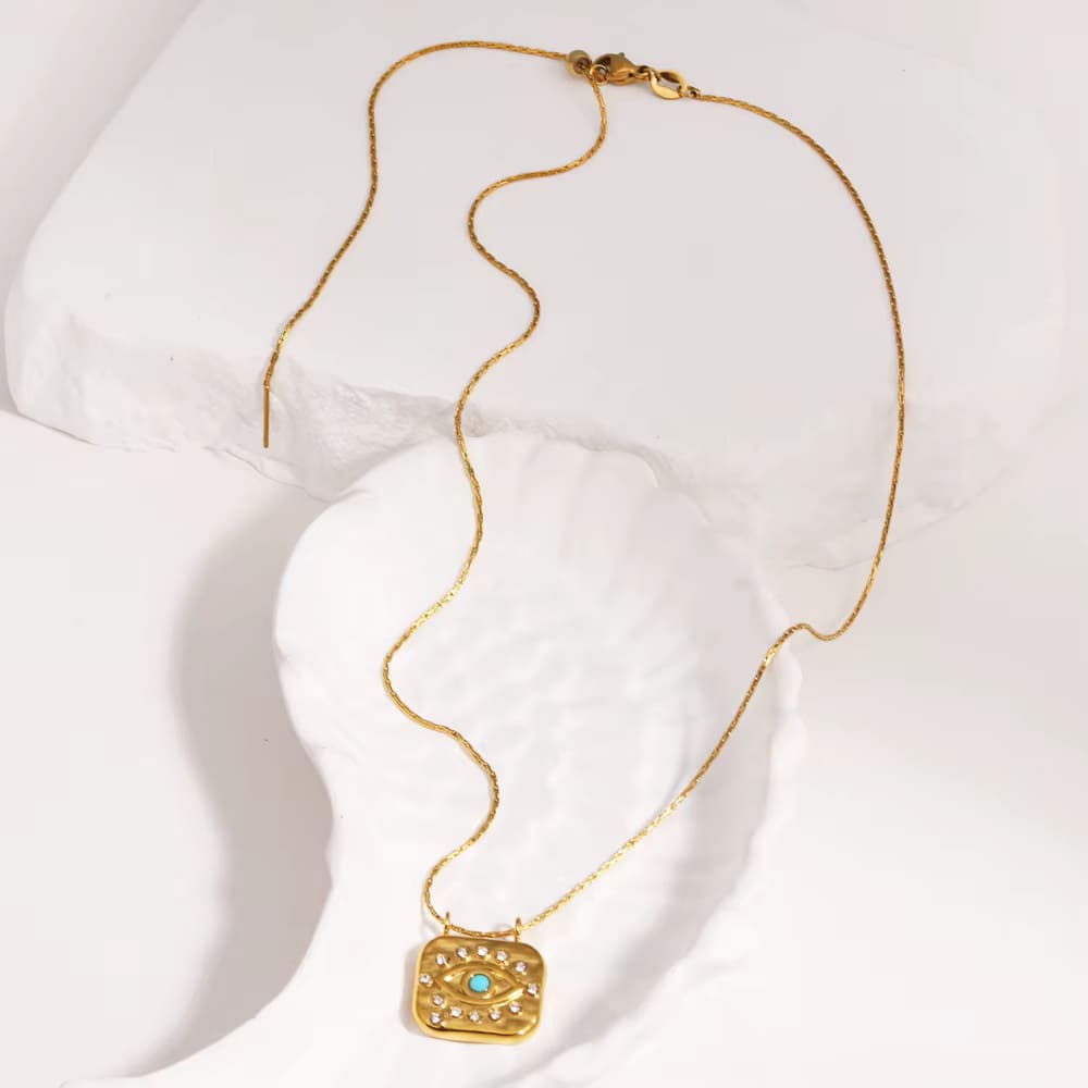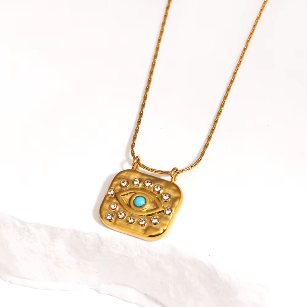 Ce somptueux collier en acier doré se distingue par son design à la fois moderne, spirituel et artisanal, mettant en valeur un pendentif gravé en forme d’œil protecteur, orné d’une pierre turquoise centrale et entouré d’une constellation de petits strass lumineux. Grâce à sa longueur de 50 cm et à son fermoir réglable, il s’adapte facilement à toutes les morphologies et peut se porter à différentes hauteurs selon le style recherché.