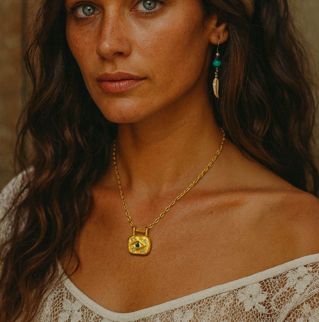 La pierre turquoise, parfaitement intégrée au cœur du pendentif, offre une touche colorée vibrante contrastant merveilleusement avec l’or du métal. Sa teinte bleu-vert évoque la sérénité, le voyage, la spiritualité et l’énergie bohème.