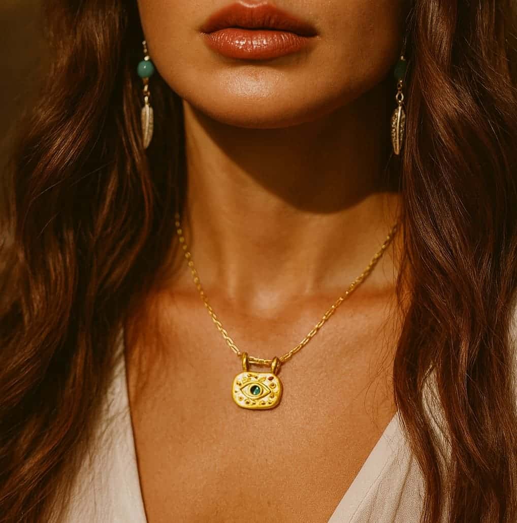 Son motif principal — un œil central incrusté d’une pierre turquoise ronde — symbolise :