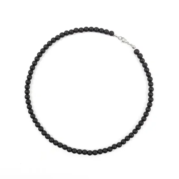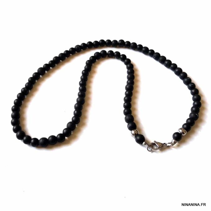 Craquez pour l’élégance et la sobriété de ce Collier onyx homme pierre naturelle noire mat 50 cm ! Il est composé de perles en onyx noire mat de 6 mm de diamètre montées sur un fil de nylon solide et resistant. Il se termine par un fermoir cylindrique en acier inoxydable, sûr et facile d’utilisation. Disponible également en 80 cm de long et avec des pierres de lave.