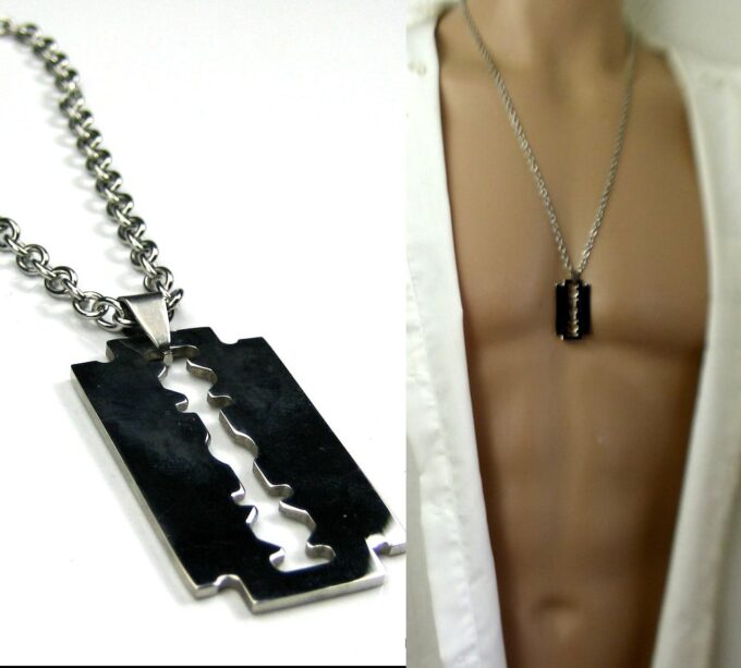 Ajoutez sans effort une touche rebelle à votre look unique avec ce superbe Collier lame de rasoir homme pendentif Acier inoxydable composé d’un pendentif lame de rasoir en acier inoxydable argenté monté sur une chaine maille forçat en acier chirurgical et terminé par un fermoir mousqueton, sûr et facile d’utilisation.