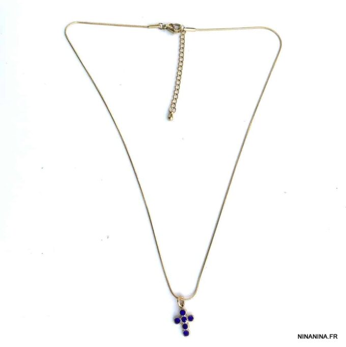 Ce collier féminin en acier doré se compose d’une breloque dorée en forme de croix serties de petites pierres bleues montée sur une chainette maille serpent en Acier Inoxydable doré. Il se termine par un fermoir mousqueton sûr et facile d’utilisation. Enfin, une chainette de réglage vient parfaire le tout pour un ajustement parfait sur votre cou.